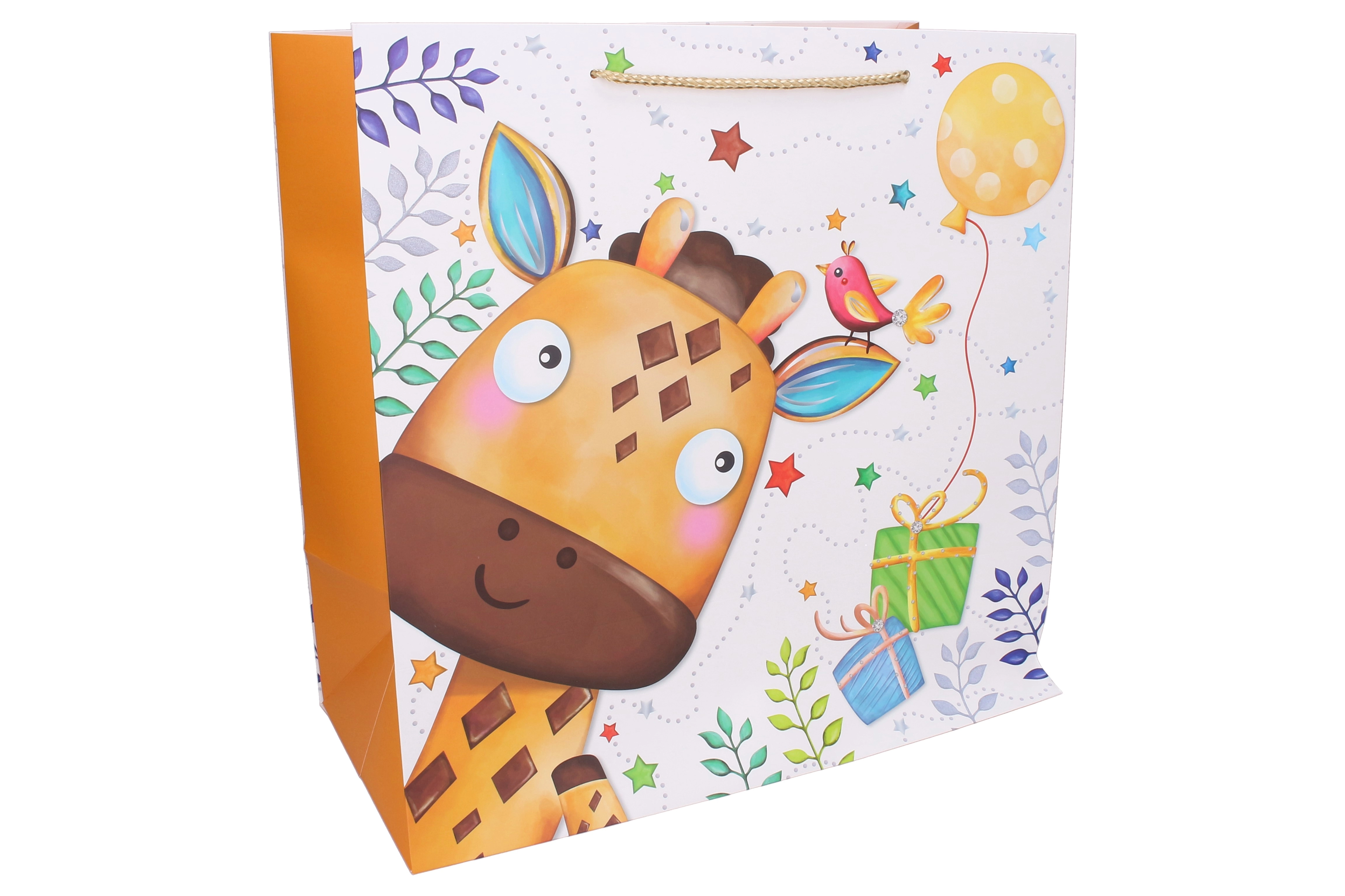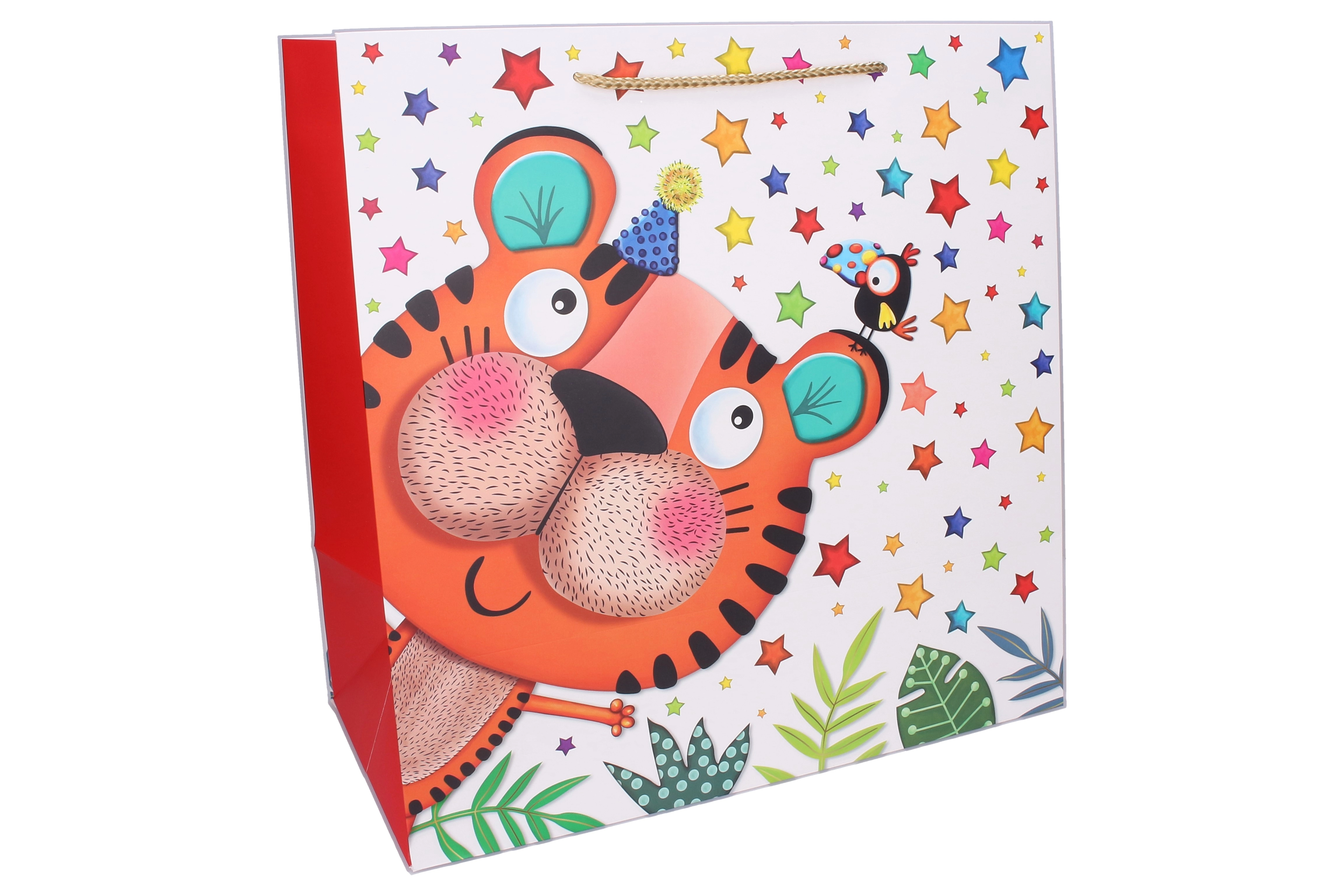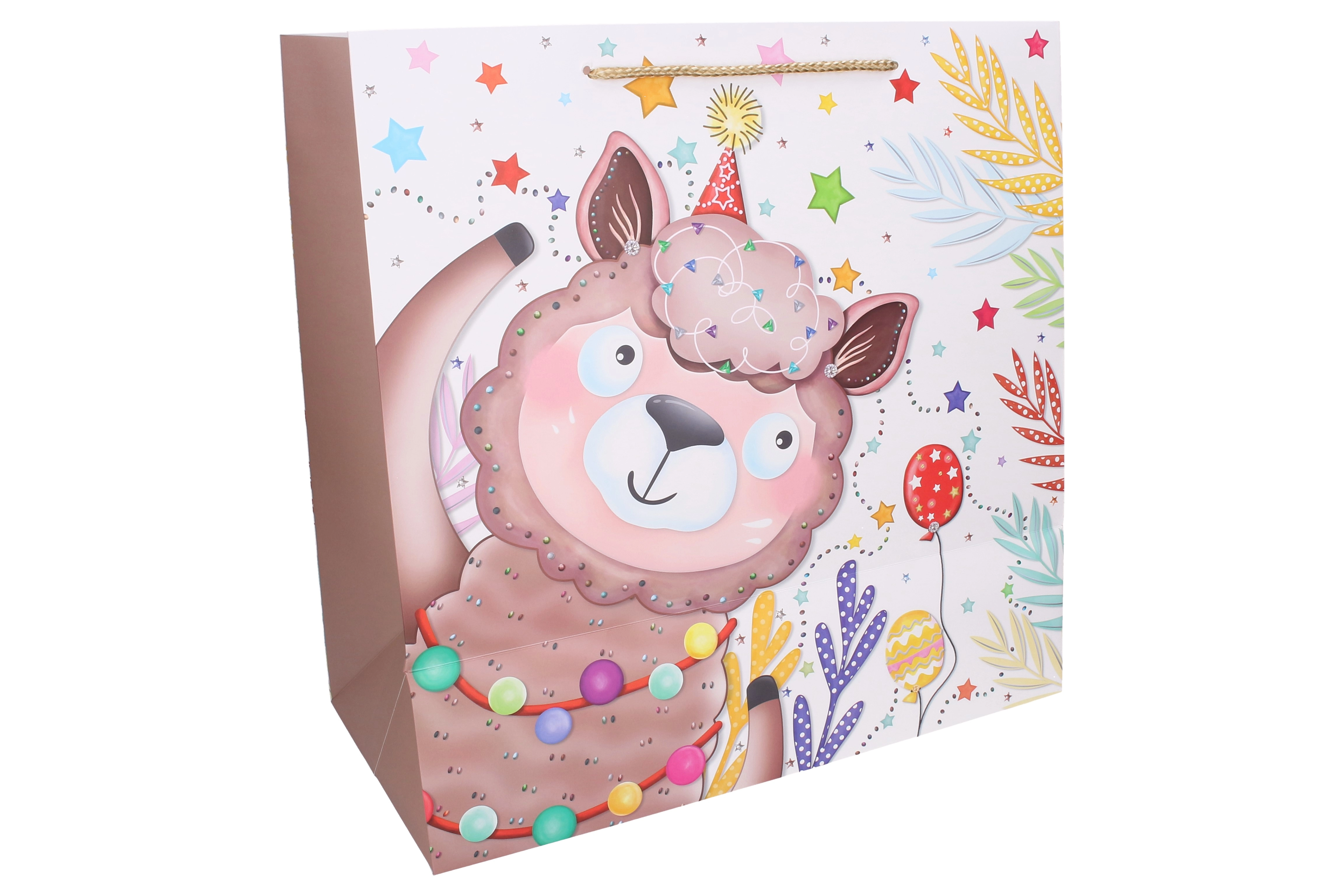 Vrolijke kindercadeautas in maat L met afmetingen 38 × 38 × 20 cm, ideaal voor verjaardagen en feestjes. Biedt een stevige papieren uitvoering, koorden handgrepen voor comfortabel dragen en schattige dierenmotieven (tijger, olifant, giraf, lama). Perfect als herbruikbare cadeautas met voldoende capaciteit dankzij de zijdelingse vouwplooien.