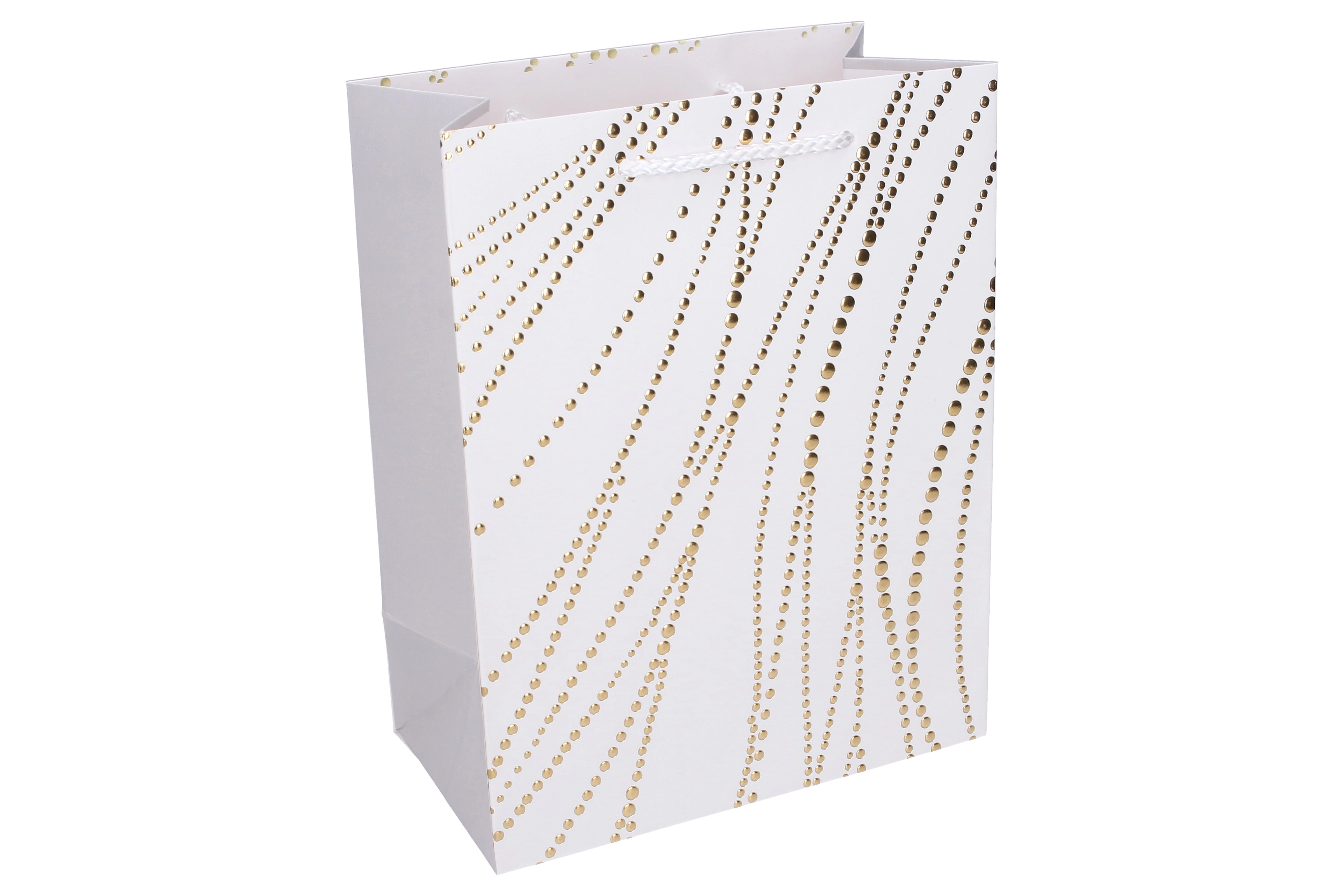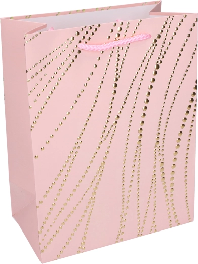 Stijlvolle cadeautas in maat M met afmetingen 26 × 32 × 12 cm voor elke dag van het jaar. Valt op door een elegant goudkleurig stippenpatroon, een stevige constructie en comfortabele koord-/lintgrepen. Een uitstekende keuze voor universele cadeauverpakking in de kleuren roze, crème, grijs en wit.