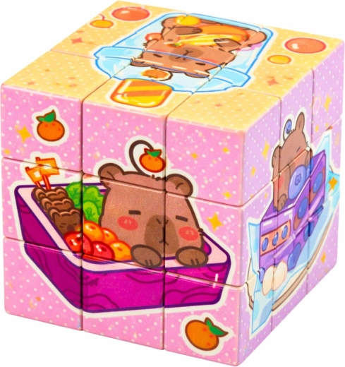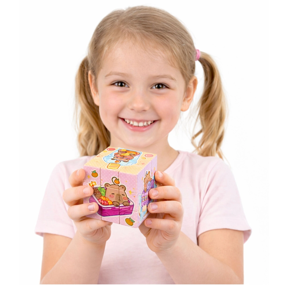 Schattige educatieve kubus met capibara-motief die kinderen boeit met kleurrijke afbeeldingen en een eenvoudig stapelprincipe. Draai en leg – op elke zijde maak je een doorlopend plaatje. Stimuleert logisch denken, oog-handcoördinatie, geduld en concentratie. Het compacte formaat van 6 × 6 cm is ideaal voor kleine kinderhanden en voor onderweg.
