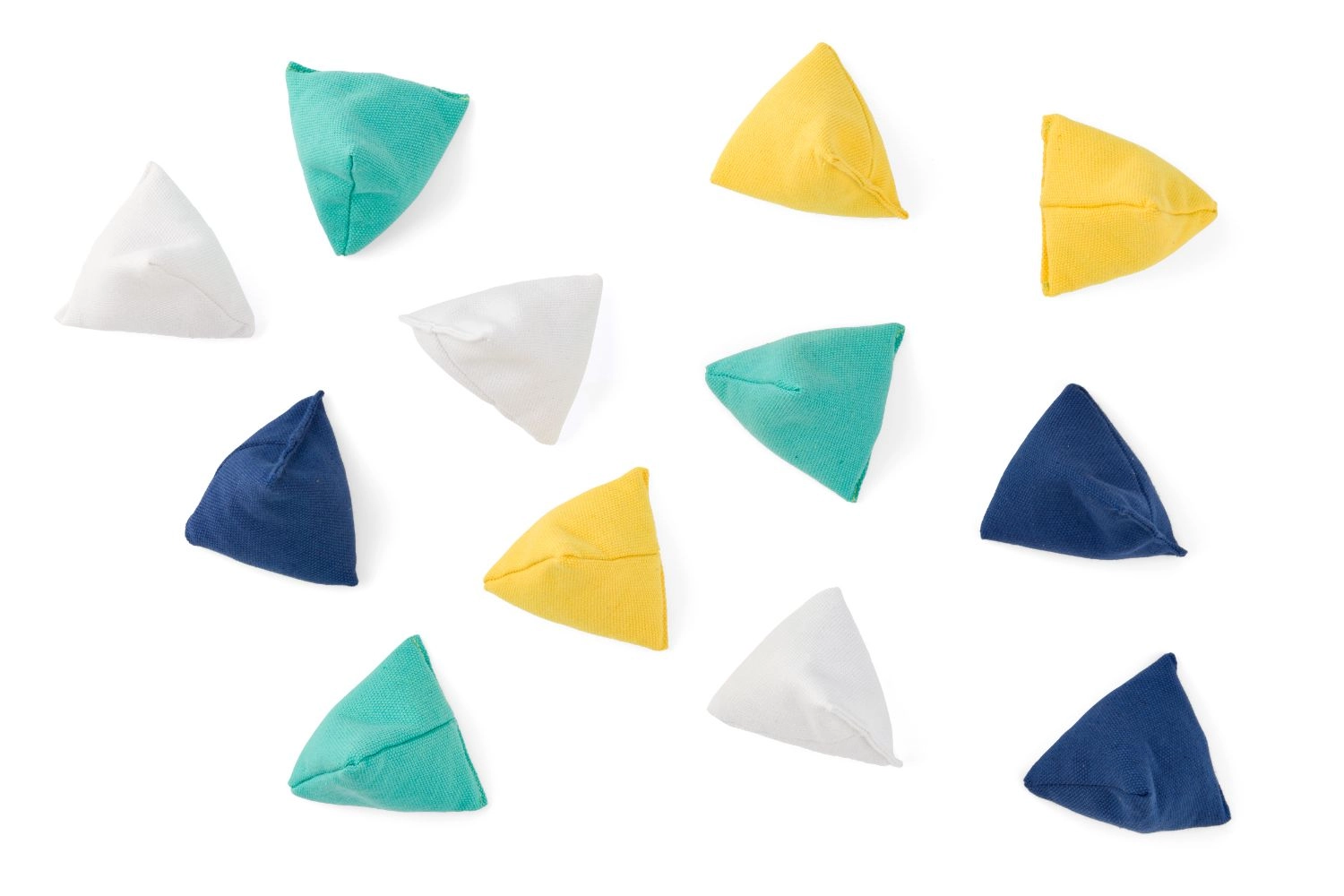 Textiele piramidezakjes in verschillende kleuren liggen goed in de hand en landen veilig – ideaal voor kinderen en volwassenen.
