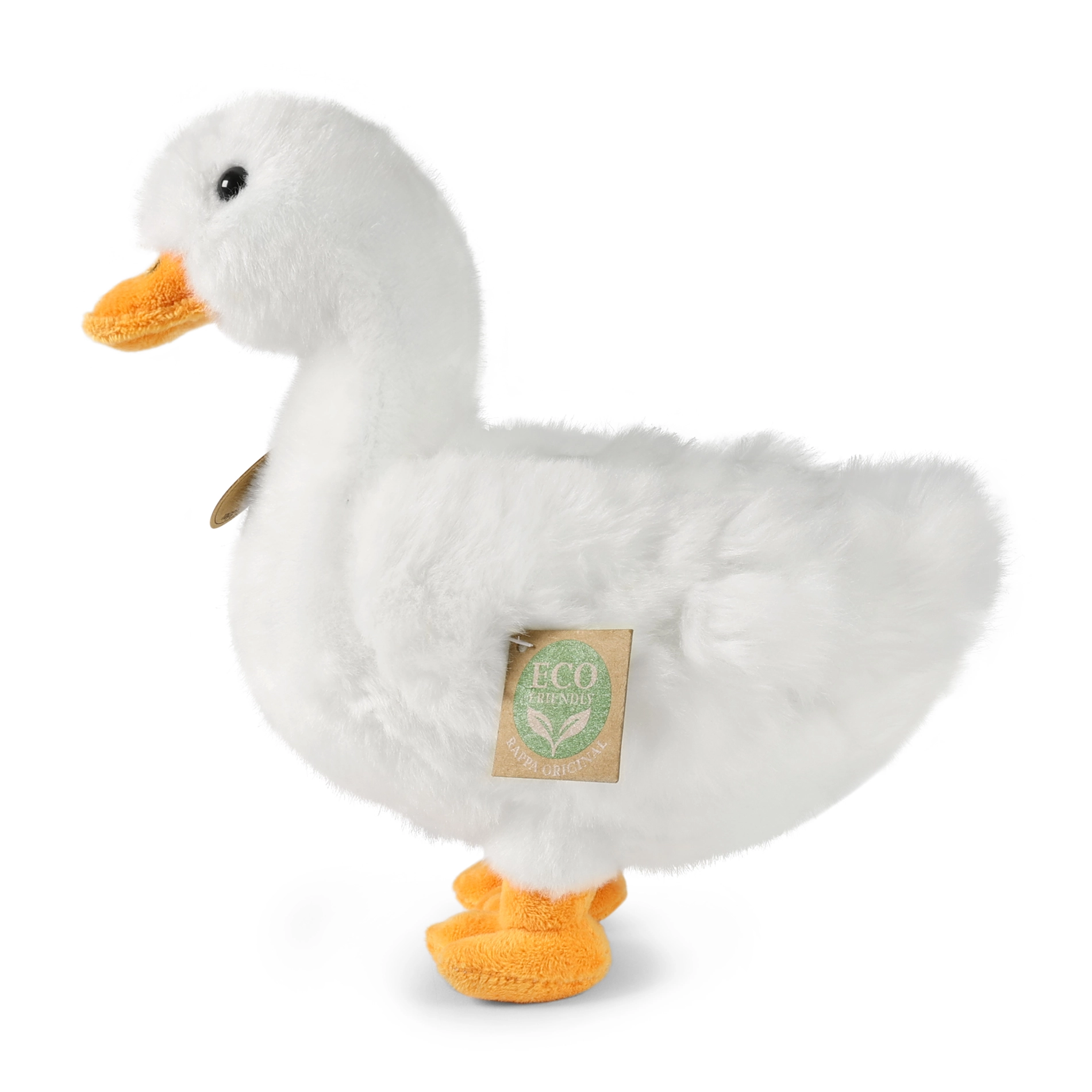 Schattige witte pluchen eend van 24 cm uit de premiumcollectie RAPPA, gemaakt van hoogwaardige en milieuvriendelijke ECO-materialen. Dankzij het handmatige vakmanschap oogt ze levensecht, is ze superzacht en knuffelig en heeft ze een veilige vulling van gerecyclede PET-flessen, geschikt zelfs voor de allerkleinsten vanaf de geboorte.