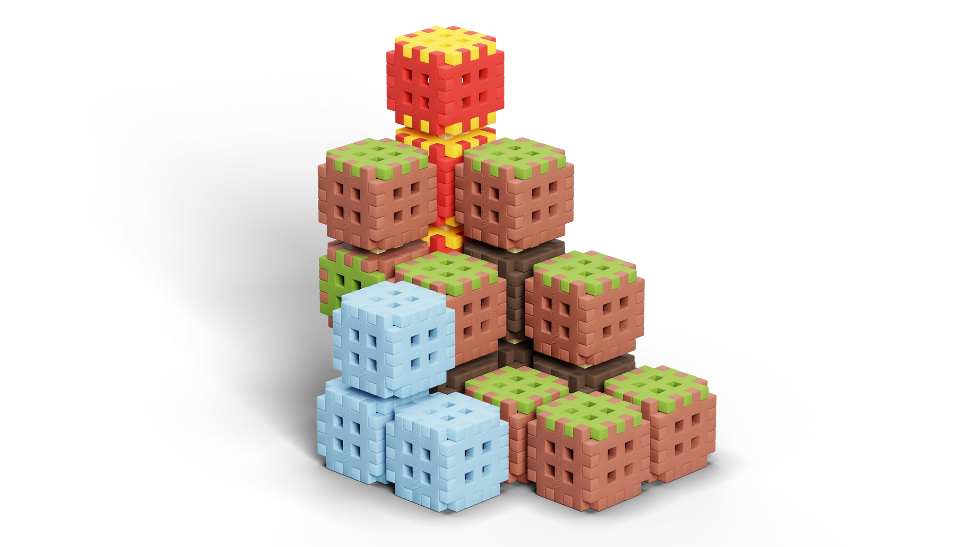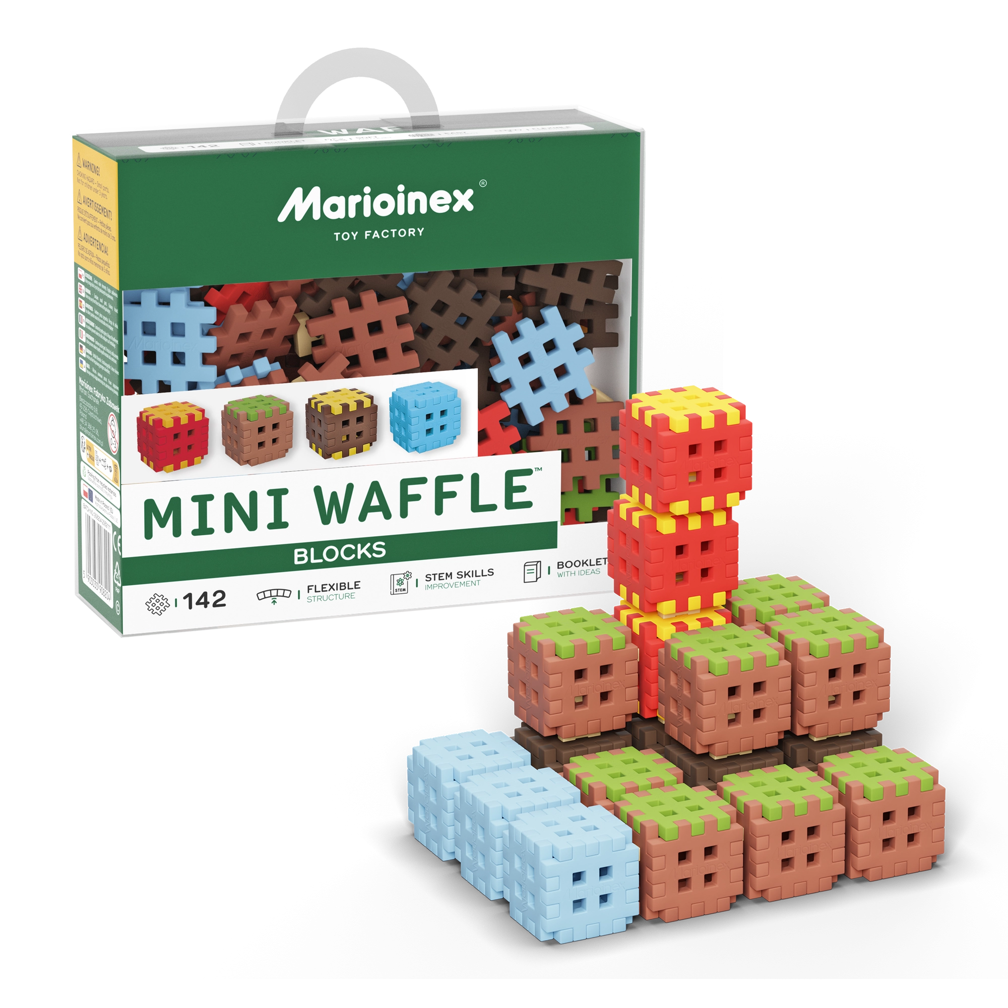 De Mini Waffle Blocks-bouwset bevat 142 kleurrijke onderdelen geïnspireerd door de natuur – bruine “aarde”, groen “gras”, ijsblauwe elementen en energieke rood-gele accenten. Dankzij het zachte en flexibele materiaal liggen de blokken prettig in de hand en klikken ze ook voor jongere kinderen makkelijk in elkaar.