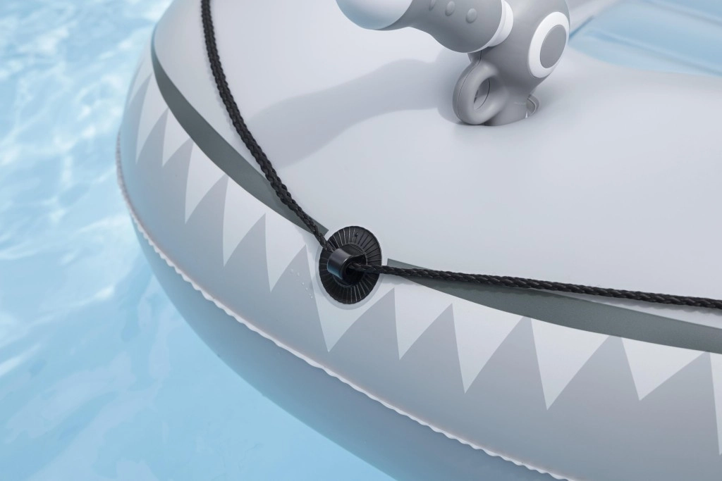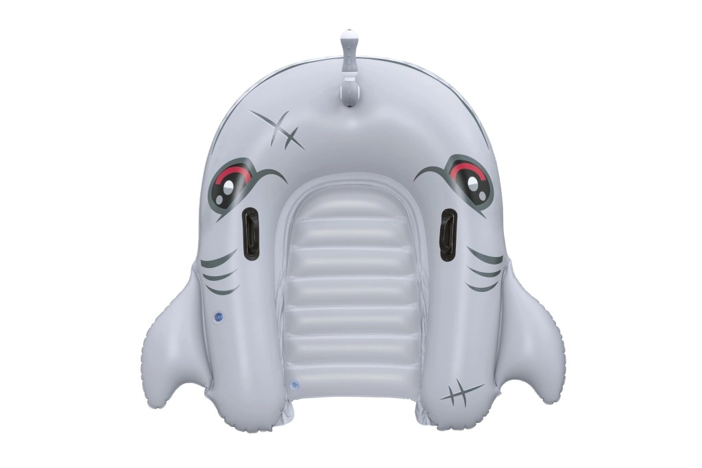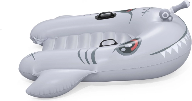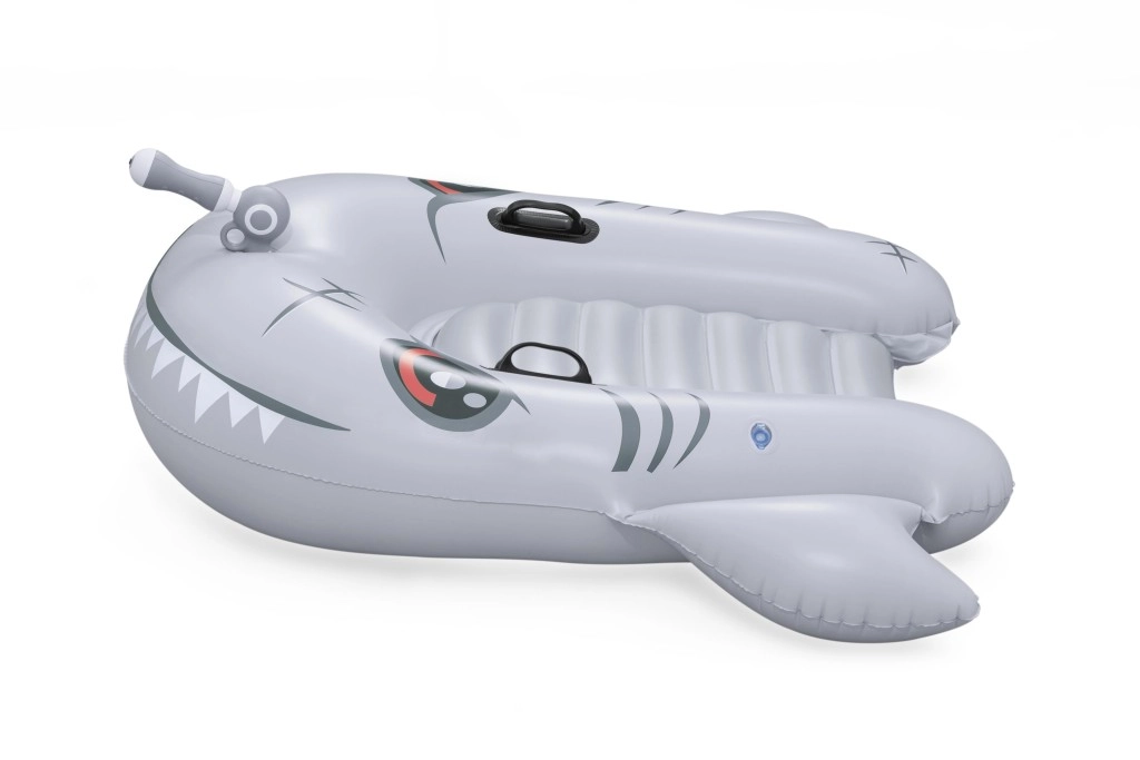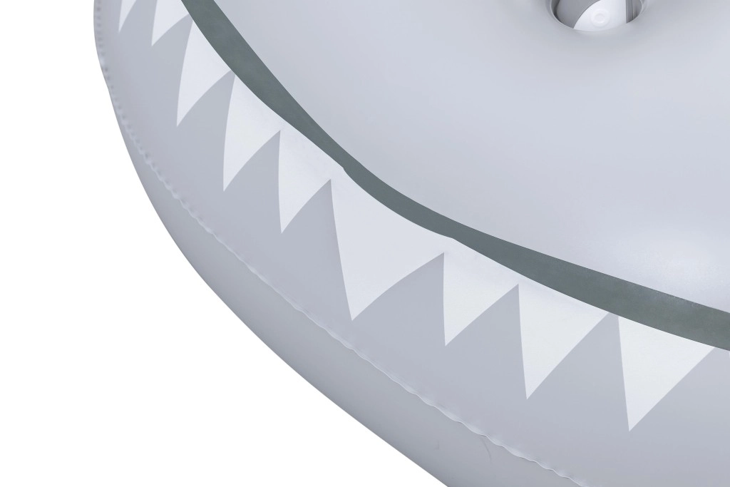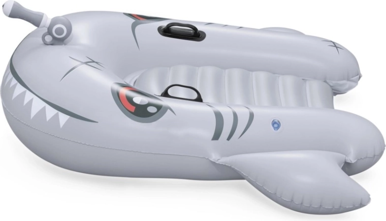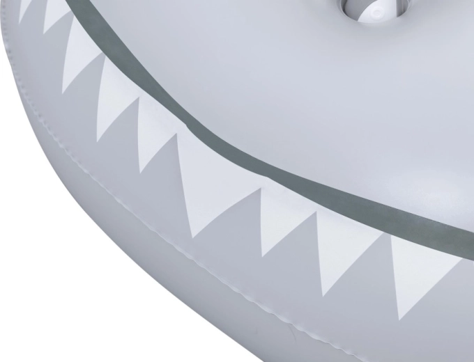 Het opblaasbare vaartuig in haaivorm brengt zowel plezier als comfort naar het zwembad. Het realistische grijs-zilveren design met ogen en tanden valt meteen op, terwijl de geribbelde zitting en verhoogde zijkanten zorgen voor een stabiele en comfortabele zit. Twee stevige handgrepen helpen kinderen hun evenwicht te bewaren en eenvoudig te manoeuvreren.