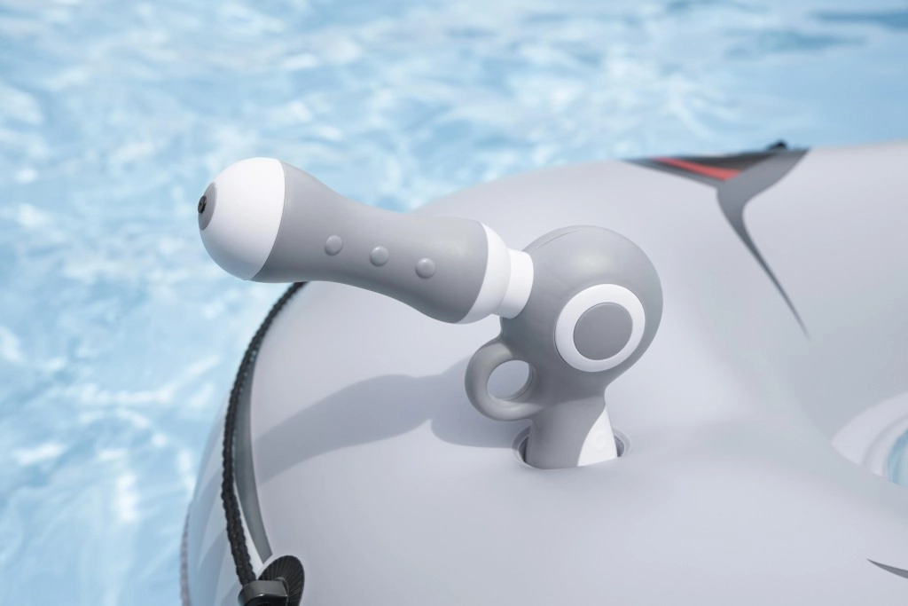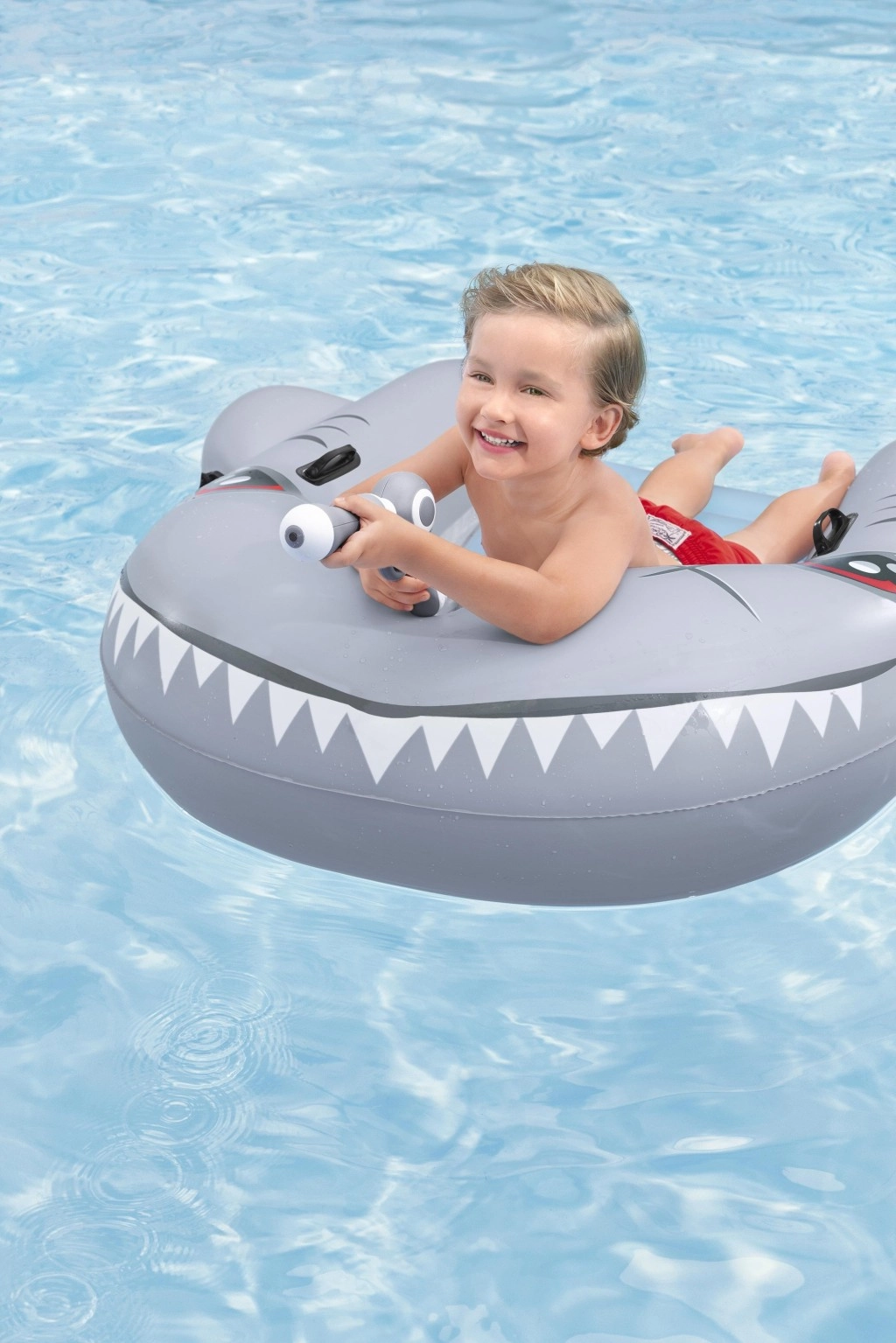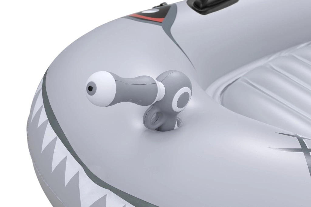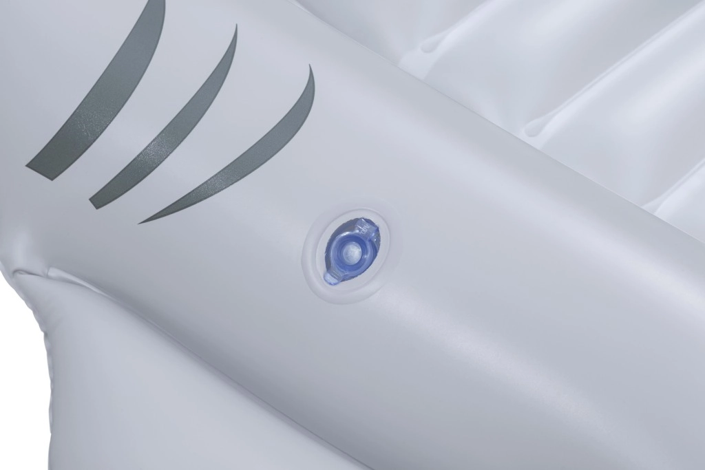 Het opblaasbare vaartuig in haaivorm brengt zowel plezier als comfort naar het zwembad. Het realistische grijs-zilveren design met ogen en tanden valt meteen op, terwijl de geribbelde zitting en verhoogde zijkanten zorgen voor een stabiele en comfortabele zit. Twee stevige handgrepen helpen kinderen hun evenwicht te bewaren en eenvoudig te manoeuvreren.