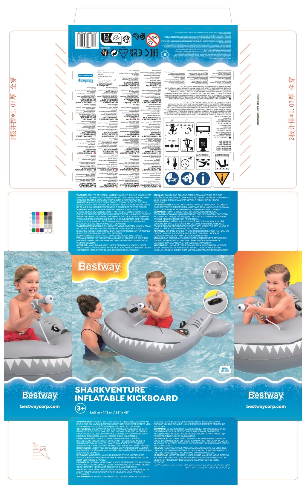 Het geïntegreerde waterkanon met slang verandert elk zwempartijtje in een actief spel. Eenvoudig opblazen en leeglaten wordt geregeld door praktische ventielen. In de verpakking zit ook een reparatiepatch voor een snelle oplossing van kleine beschadigingen, zodat de pret zonder onnodige onderbrekingen kan doorgaan.