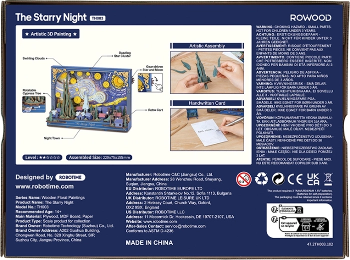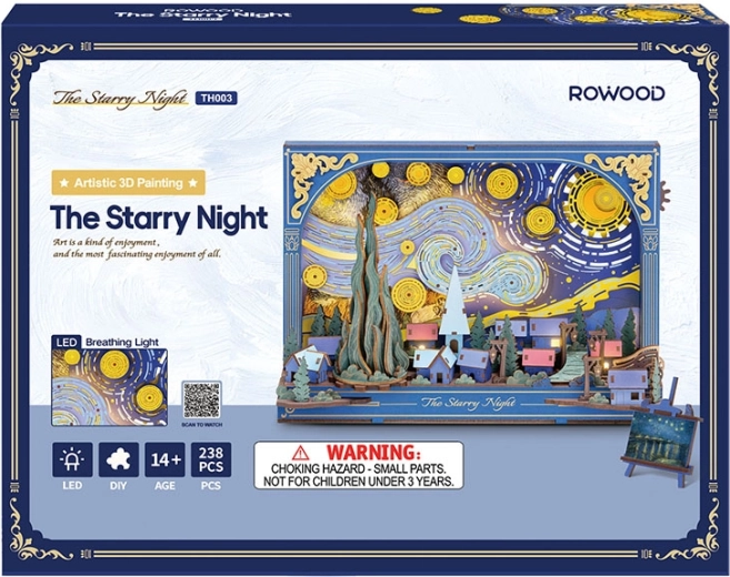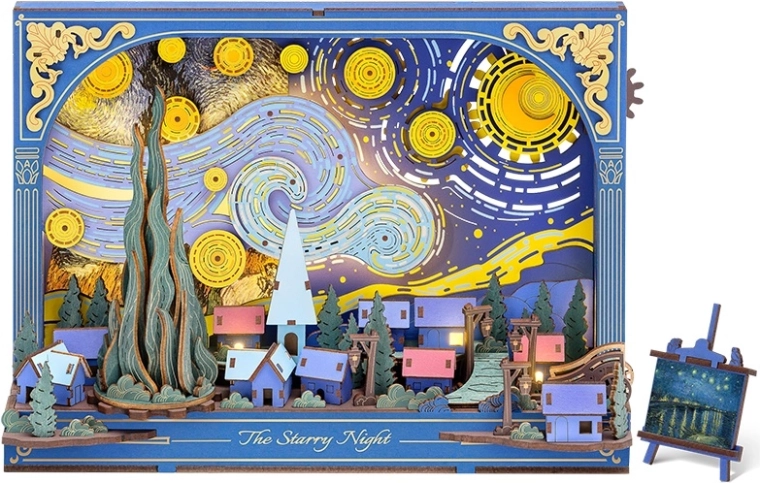 Ontdek de magie van het beroemde motief met de unieke 3D-puzzel RoboTime Sterrennacht, die na montage verandert in een stijlvolle decoratie met subtiele LED-achtergrondverlichting. Dankzij 238 onderdelen, eenvoudige montage zonder lijm en een verwisselbare achtergrond creëer je een indrukwekkend tafereel met beweegbare details – sterren, maan, cipres en een wagenwiel. Ideaal als nachtlampje, cadeau en designaccessoire voor het interieur.