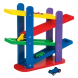 De houten racebaan met drie gekleurde autootjes zorgt voor eindeloos speelplezier dankzij het gemakkelijke omklappen op de kleurrijke cascaderende baantjes.