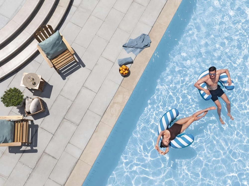 Na onderdompeling komt het materiaal tot leven met intensere tinten, waardoor de float er bij elke zwembeurt modern en stijlvol uitziet.