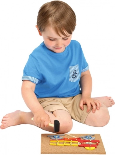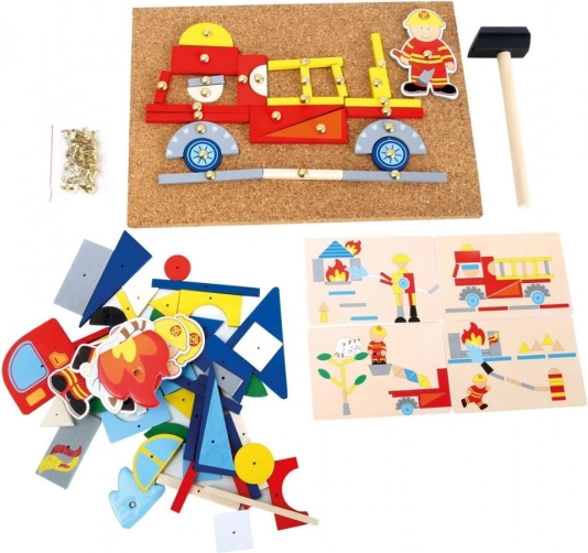 Creatief motorisch spel voor kleine klussers met een brandweerthema. Kinderen bevestigen met een houten hamertje en spijkertjes gekleurde vormen op een kurken ondergrond en stellen zo hun eigen afb... Meer tonen