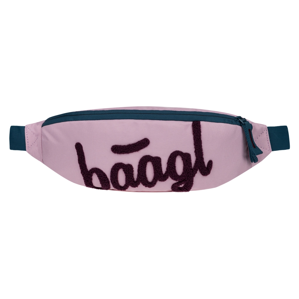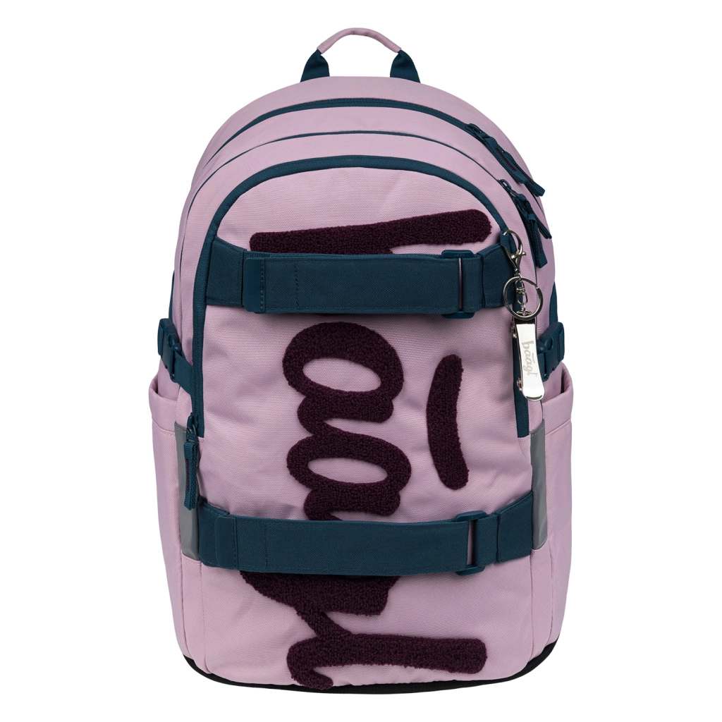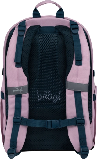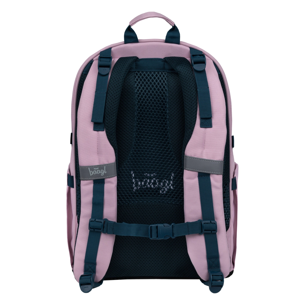 Stijlvolle en functionele BAAGL Skate Rose-schoolset voor oudere leerlingen en studenten, met een licht anatomische rugzak met skateboardriemen, een ruim etui, een opvouwbare sporttas, een praktische heuptas en een laptophoes. Alles gemaakt van gerecyclede, waterafstotende materialen met GRS-certificering, met kwalitatieve YKK-ritsen en reflecterende elementen voor dagelijkse veiligheid.
