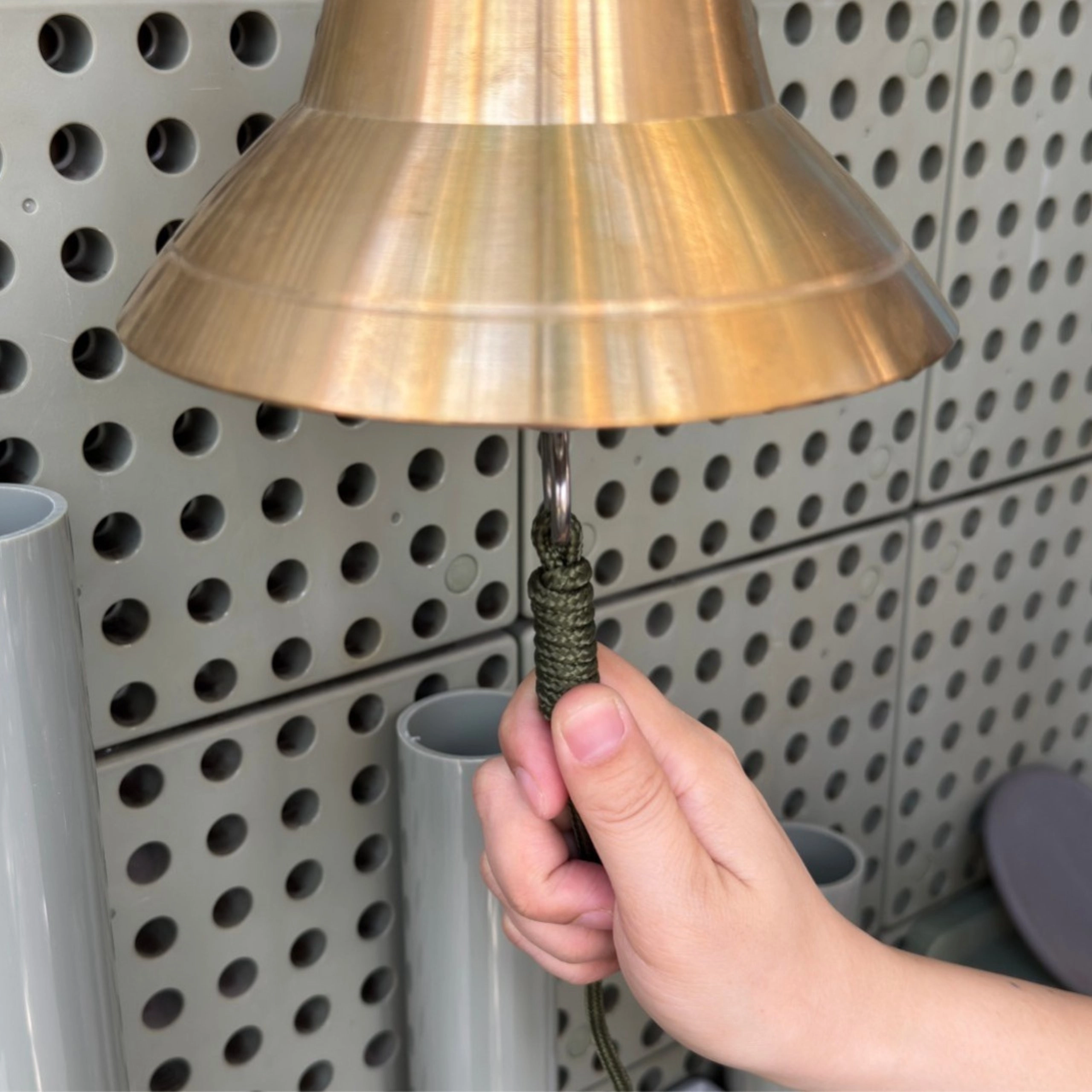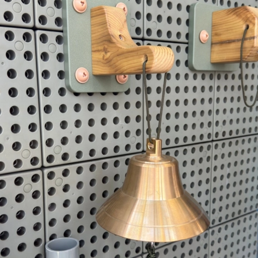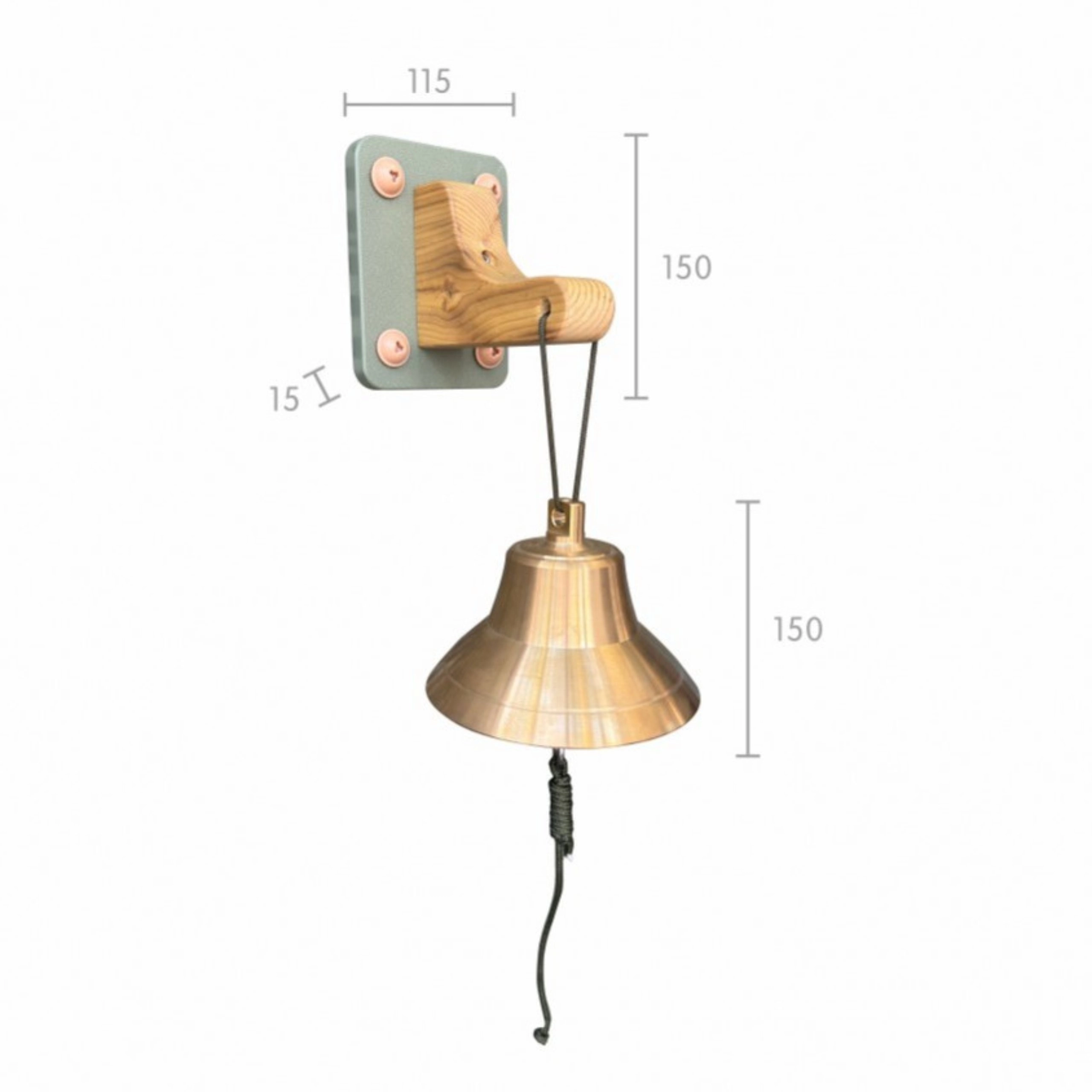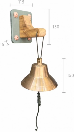 Bronzen bel (15 cm), houten wandhouder, stevig koord