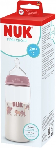 Praktische NUK First Choice babyfles met Temperature Control-functie helpt voorkomen dat een drankje te heet wordt geserveerd – de indicator tussen de markeringen verandert van blauw naar wit. De fles van hoogwaardig BPA-vrij polypropyleen heeft een wijde hals voor eenvoudig vullen en reinigen en een orthodontische anti-koliek speen voor natuurlijk zuigen. Inhoud 300 ml, geschikt vanaf 3 maanden (M).