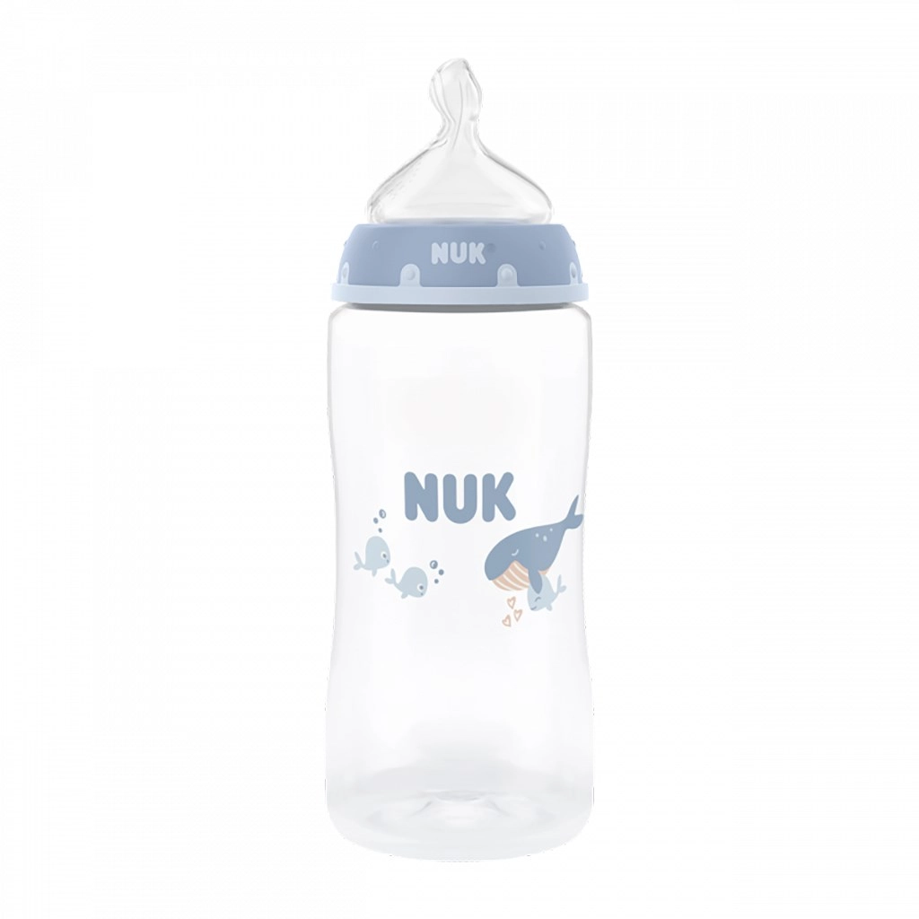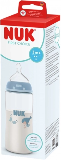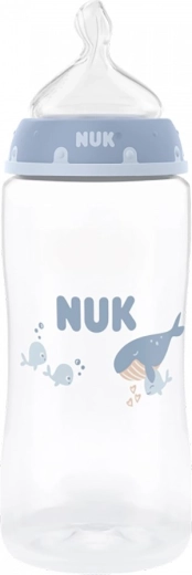 Gemaakt in Duitsland van hoogwaardig BPA-vrij polypropyleen; de fles is licht, duurzaam en prettig vast te houden. De brede bodem zorgt voor stabiliteit, het zacht gevormde fleslichaam maakt veilig grijpen en eenvoudig reinigen mogelijk. Het Whale-design verrukt met een speelse look en de fles is volledig compatibel met het NUK First Choice-systeem voor onbeperkte combinaties.