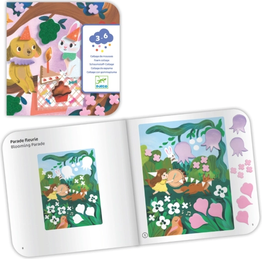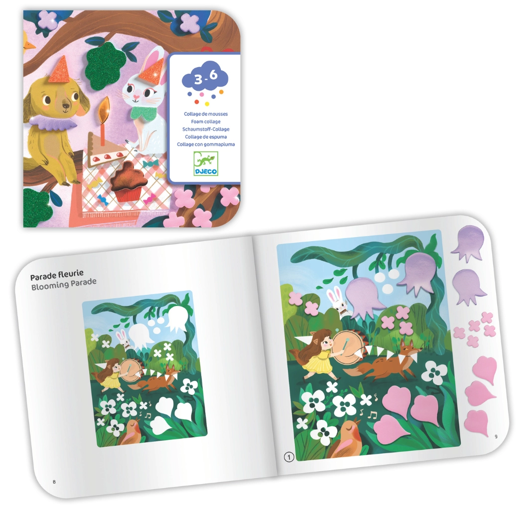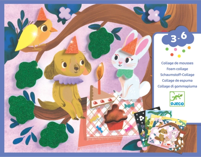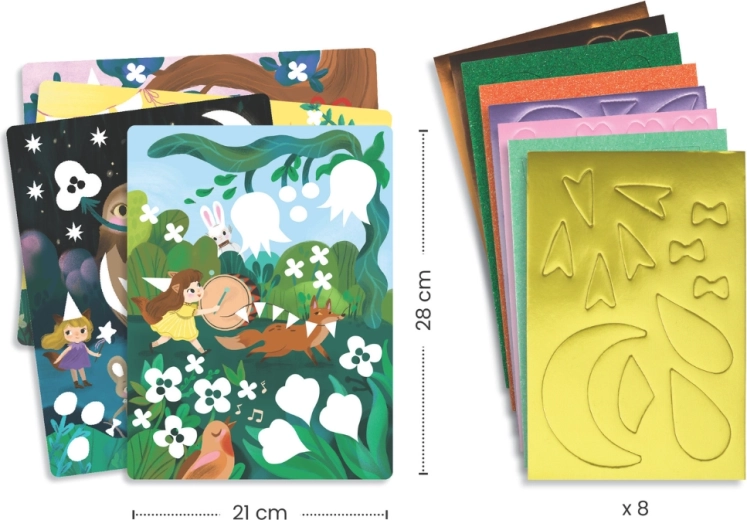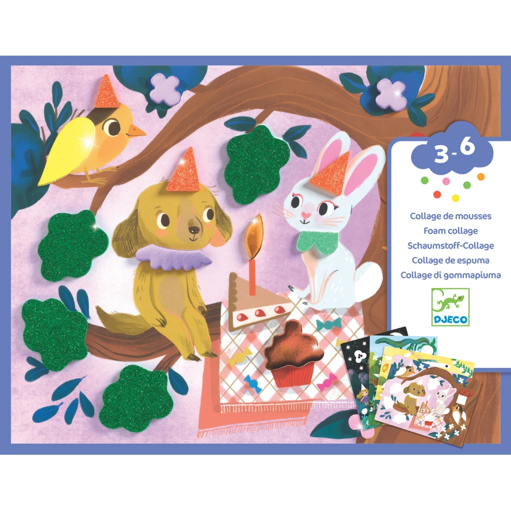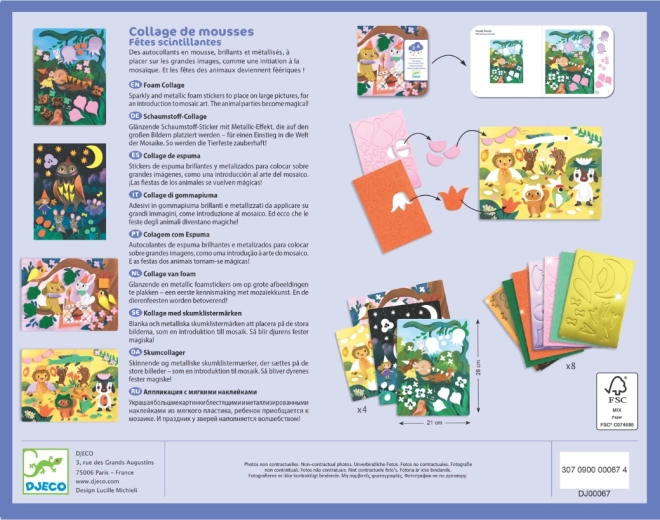Deze originele schuimcollage “Glanzende feestjes” geeft kinderen plezier in knutselen zonder rommel. Voorbedrukte kartonnen achtergronden met schattige dieren worden afgewerkt met kleurrijke, vaak glinsterende, schuimvormen. Kinderen halen de voorgeponste stukjes eenvoudig los en plakken ze volgens de instructies of hun eigen fantasie.