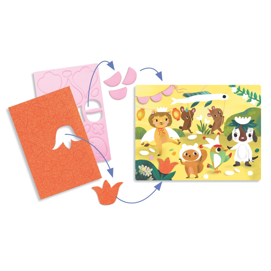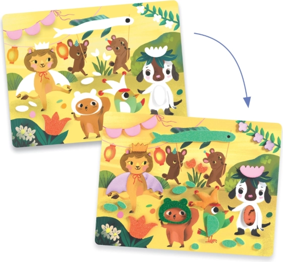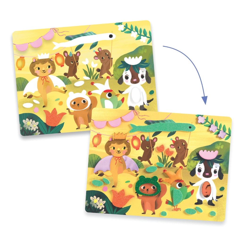 Dankzij zelfklevende schuimvormen met een glanzend oppervlak maken kinderen eenvoudig sprankelende kunstwerkjes met dieren op een feestje. Geen rommel, gewoon lospeuteren en plakken.