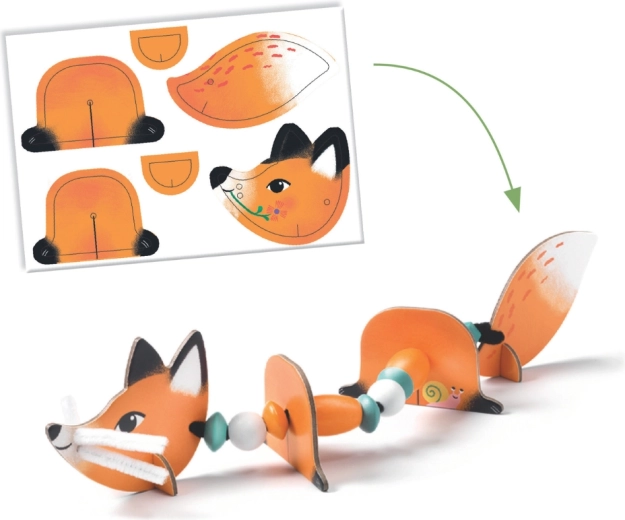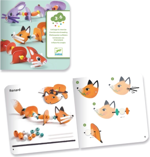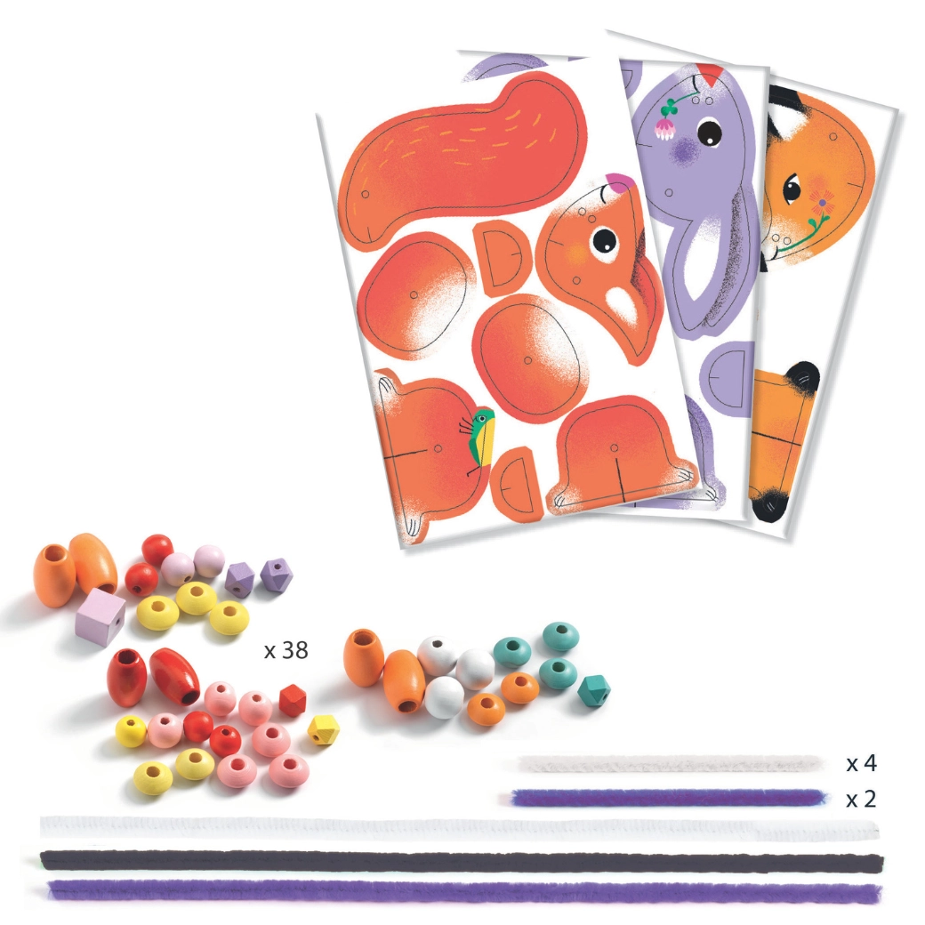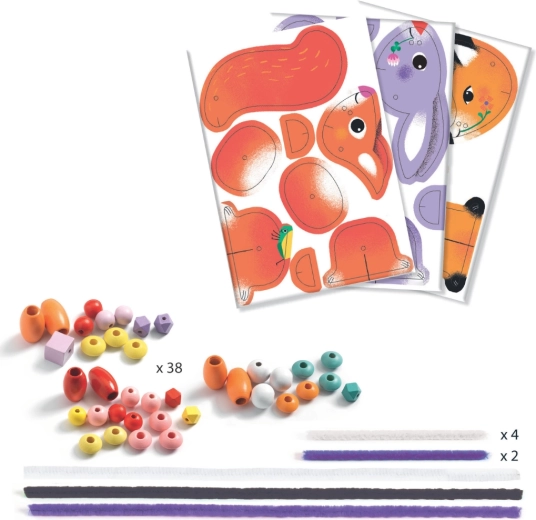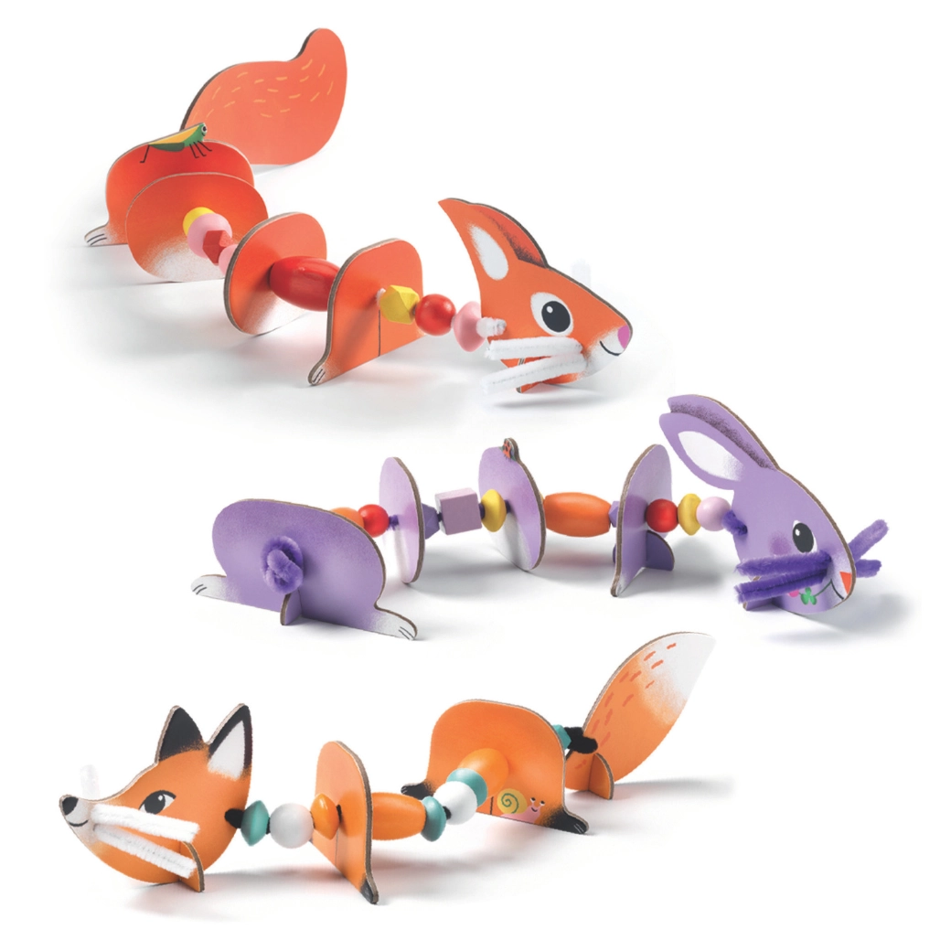 Deze kleurrijke set van DJECO maakt van rijgen een boeiend spel. Kinderen zetten uit stevig geïllustreerde onderdelen een vos, een konijntje en andere dieren in elkaar, die ze verbinden met koorden en kralen. Dankzij de segmenten bewegen de figuurtjes mooi en oefenen kinderen geduld en logisch ordenen.