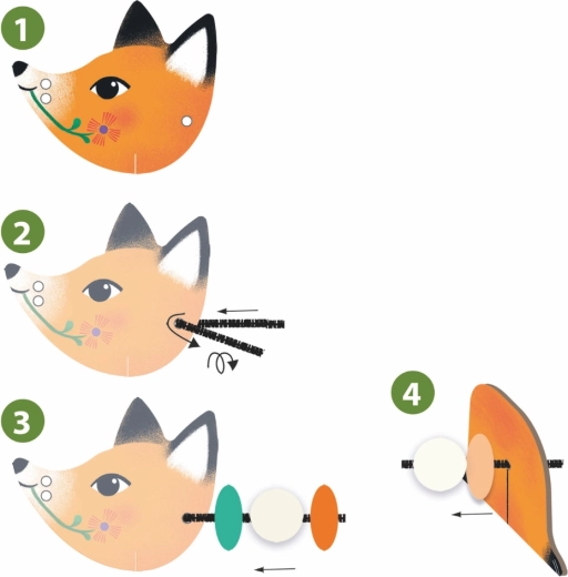 Gedeelde onderdelen van stevig karton worden verbonden met kralen aan een koord – zo ontstaan beweegbare figuurtjes van vossen en een konijntje, die kinderen graag neerzetten en laten bewegen.