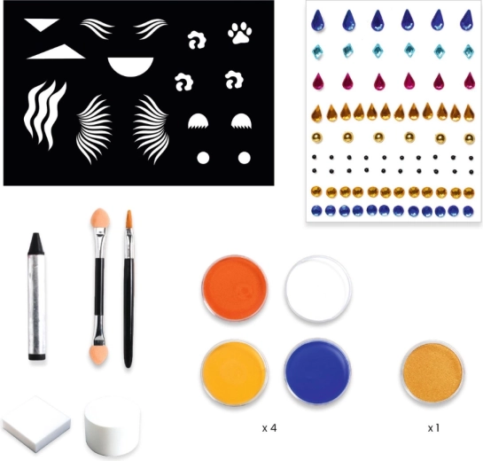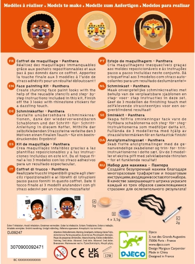 Ontdek de leuke gezichtsschminkset met junglethema van DJECO. Verander jezelf in een tijger, jachtluipaard of leeuw dankzij de heldere, intense kleuren, handige sjablonen en eenvoudige applicators. Ideaal voor kinderfeestjes, carnavals en creatief spel.
