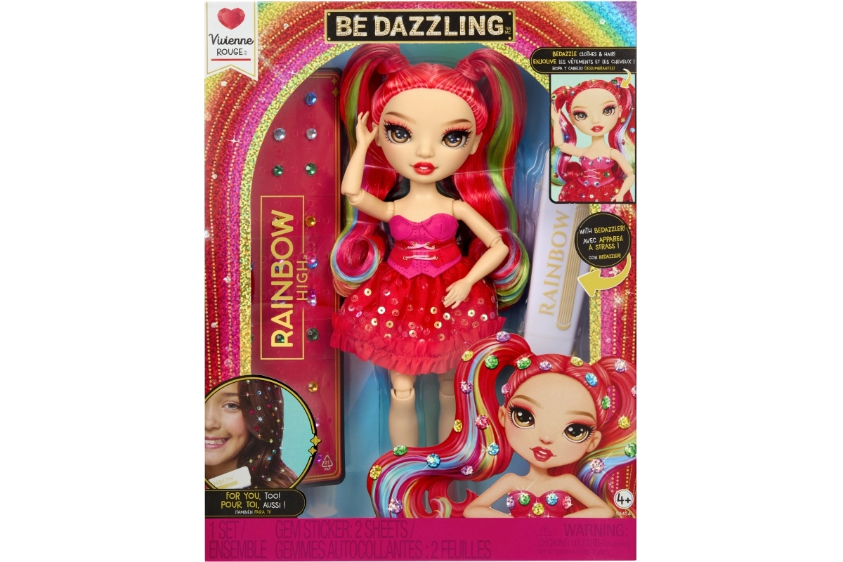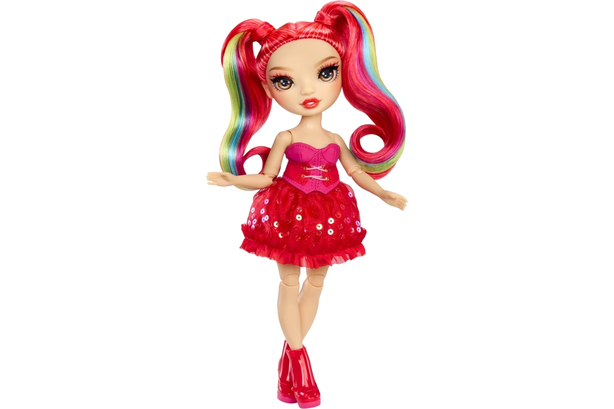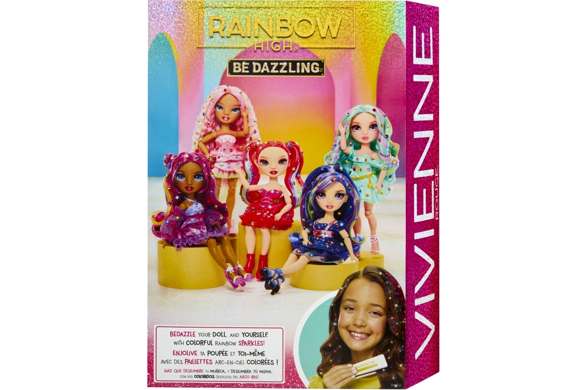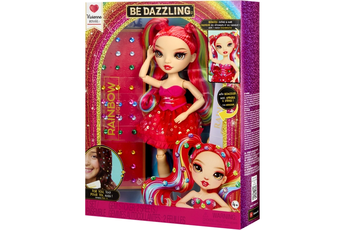 De Rainbow High-pop Vivienne Rouge brengt een krachtige rode energie naar je collectie, met mode geïnspireerd door het regenboogspectrum. Haar lange doorkambare haren met regenbooglokjes, glinsterende jurk en bijpassende schoenen maken indrukwekkende combinaties mogelijk om mee te spelen of om neer te zetten. Dankzij de gewrichten in armen, benen en hoofd poseer je haar eenvoudig in verschillende houdingen.