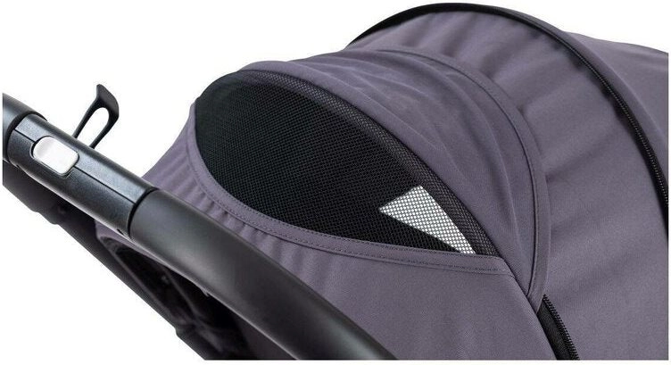 De verstelbare kap met raam biedt zicht op je kind en bescherming tegen de zon, terwijl het ventilatiepaneel de luchtcirculatie verbetert.