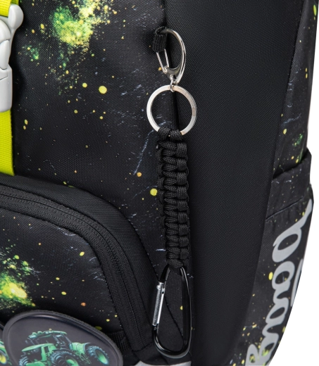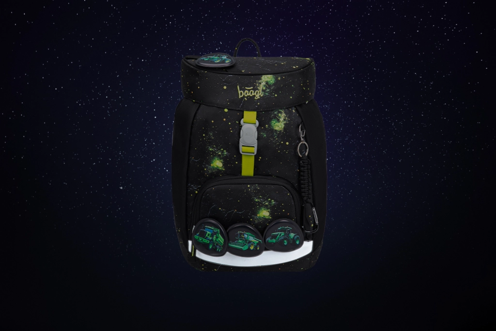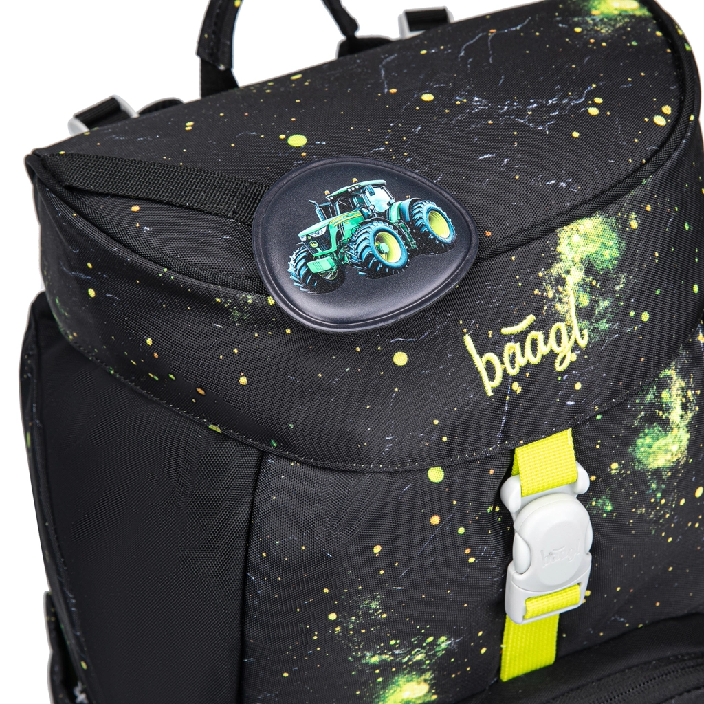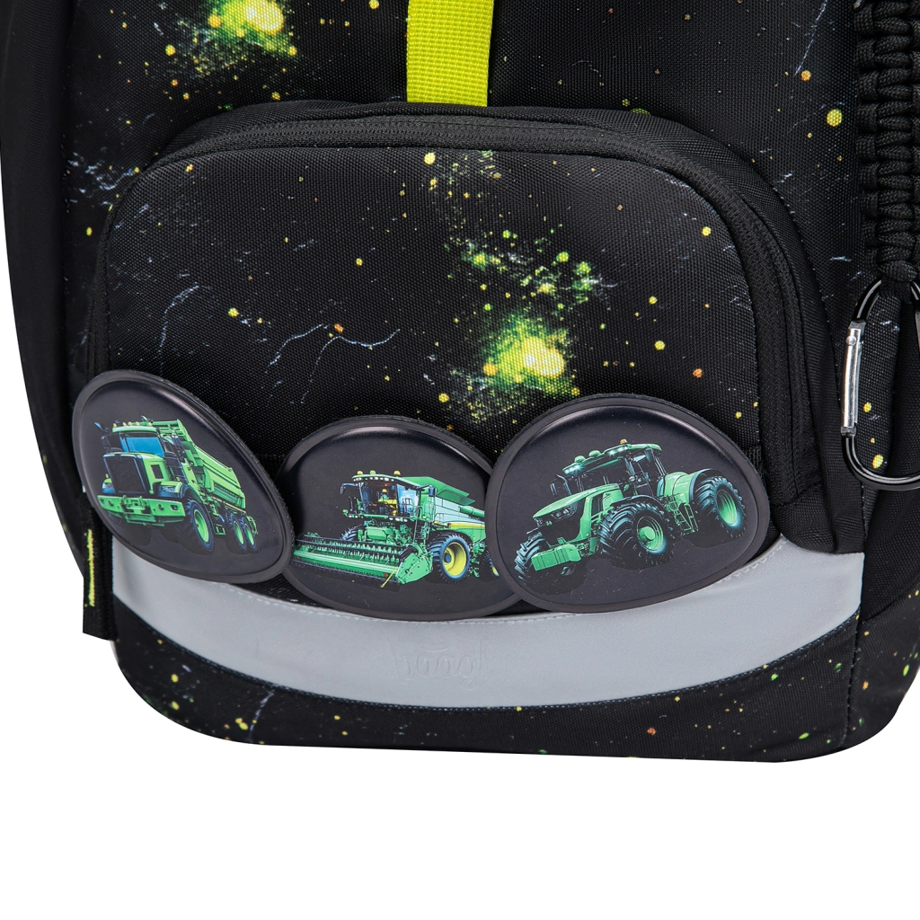 De praktische enkelvoudige indeling met binnenvak en elastiek voor mappen maakt het organiseren van schoolspullen eenvoudig. De rugzak is gemaakt van gerecyclede, waterafstotende materialen en voorzien van opvallende reflecterende elementen voor betere zichtbaarheid en veiligheid. Het intuïtieve Magnetic Click-sluitingssysteem is zelfs voor beginnende leerlingen makkelijk te bedienen. Het design is eenvoudig te veranderen dankzij afneembare badges (patches) met tractormotief.