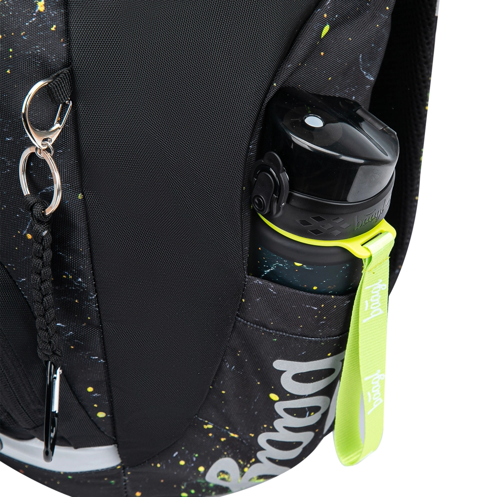 Enkelvoudige hoofdruimte met vak en elastiek voor mappen, zijvakken voor een fles, duurzame ritsen en reflecterende elementen voor betere zichtbaarheid.