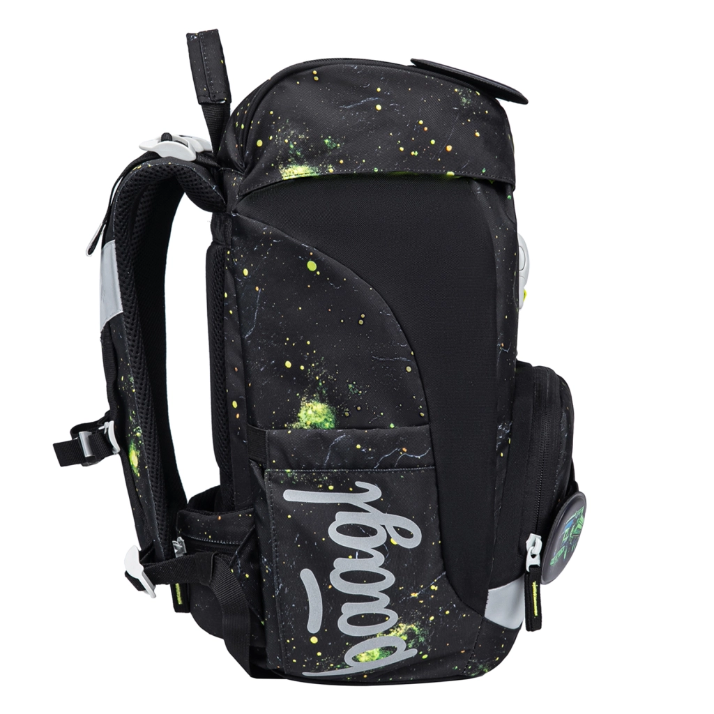 De interne eenkamerindeling met vak en elastiek voor het vastzetten van mappen helpt orde te houden in schoolspullen. De rugzak en accessoires zijn gemaakt van waterafstotende, GRS-gecertificeerde gerecyclede materialen en aangevuld met reflecterende elementen voor betere zichtbaarheid. Het design met verwisselbare badges (patches) laat kinderen het uiterlijk eenvoudig aanpassen.