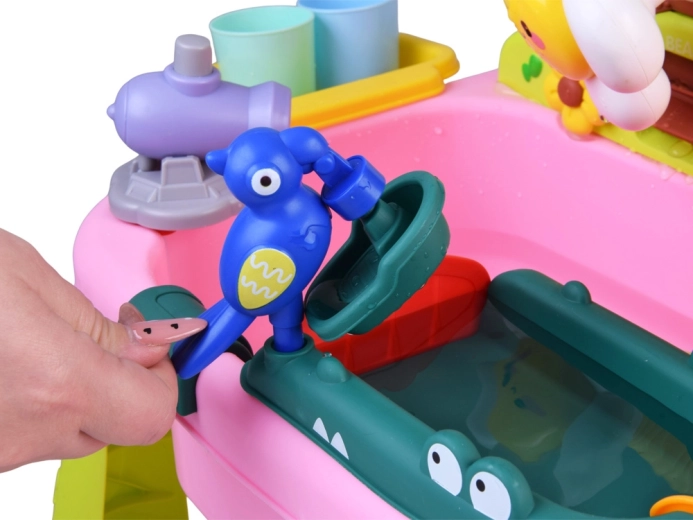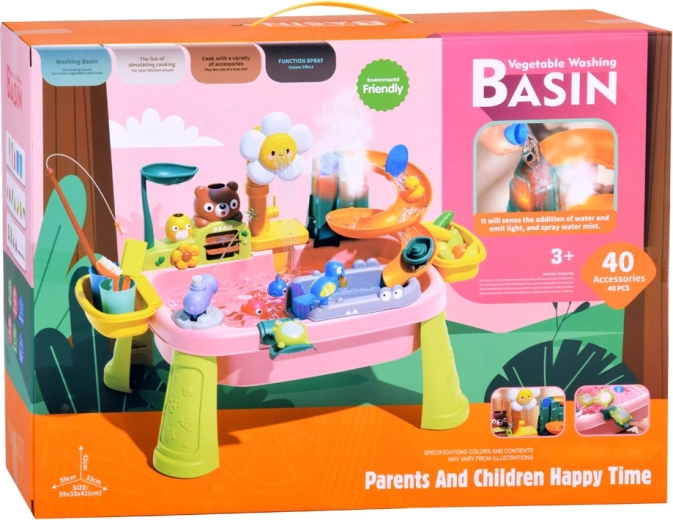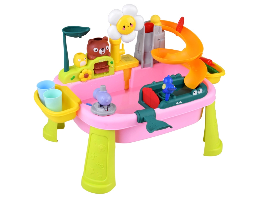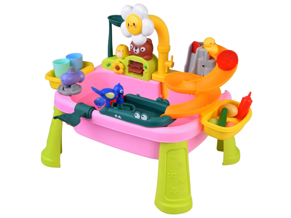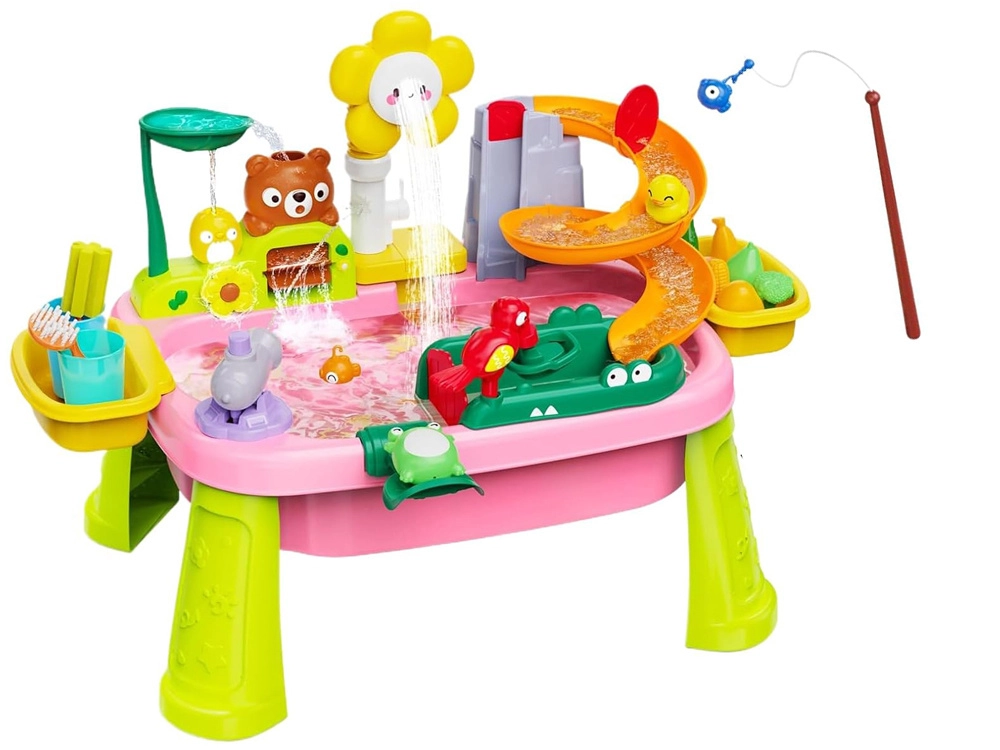 Ontdek het plezier met de kleurrijke watertafel die elke dag in een avontuur verandert. Kinderen genieten van stromend water, een glijbaan, een bloemvormige sproeier, vissen en het wassen van “etenswaren”. De tafel stimuleert creativiteit, fijne motoriek en zintuiglijke waarneming – ideaal voor binnen en buiten.