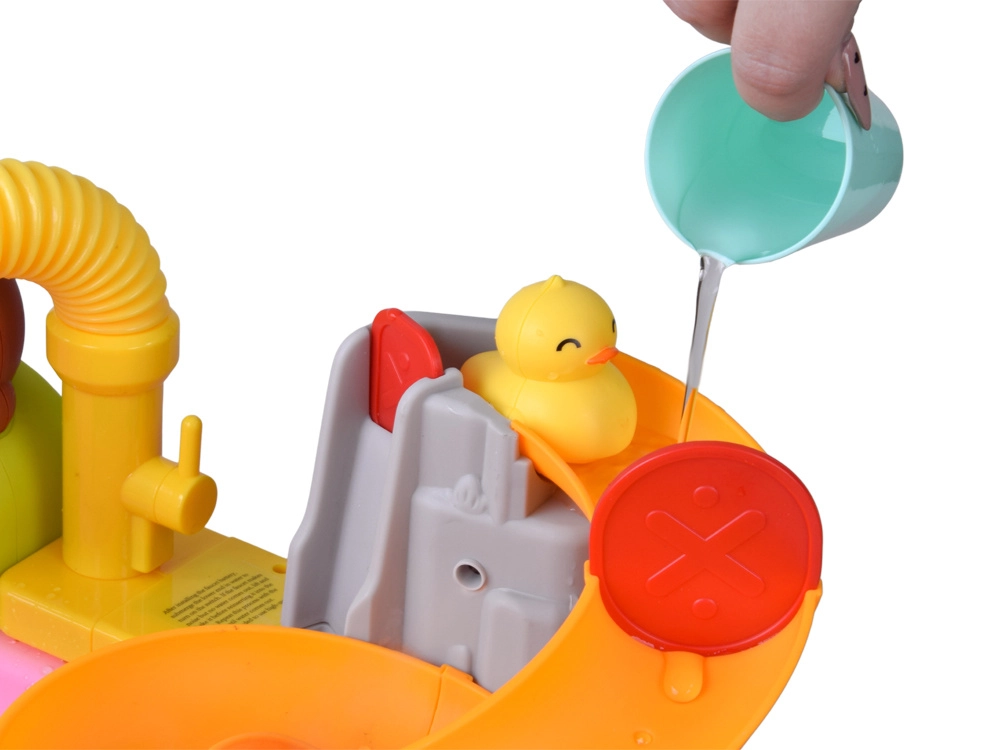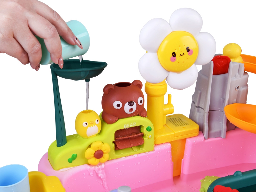 Deze interactieve watertafel biedt kinderen tal van speelmogelijkheden met water: gieten, sproeien, vissen en bootjes laten varen. De bloemvormige sproeier geeft een realistisch watereffect en de leuke kanaaltjes en wielen laten zien hoe water onderdelen in beweging zet.