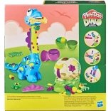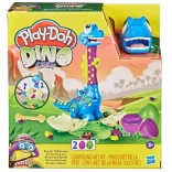 Help de kleine Bronto uit het ei te komen en kijk hoe zijn nek groeit! Vul gewoon de PLAY-DOH-figuur en druk op de staart – de nek schuift uit en het plezier kan beginnen. Met de vormpjes op de figuur en het ei maak je bladeren, bloemen, botten en een stijlvolle strik.