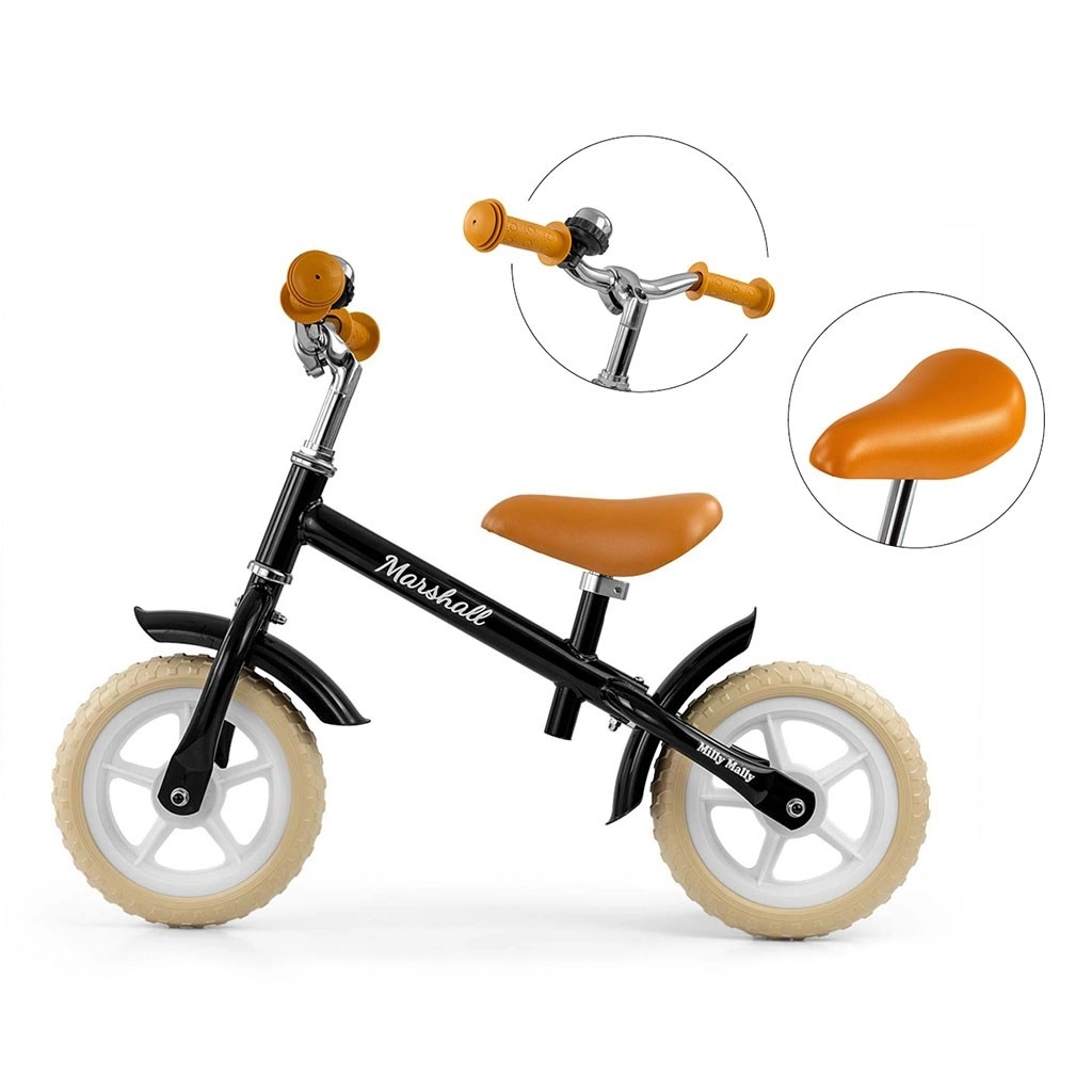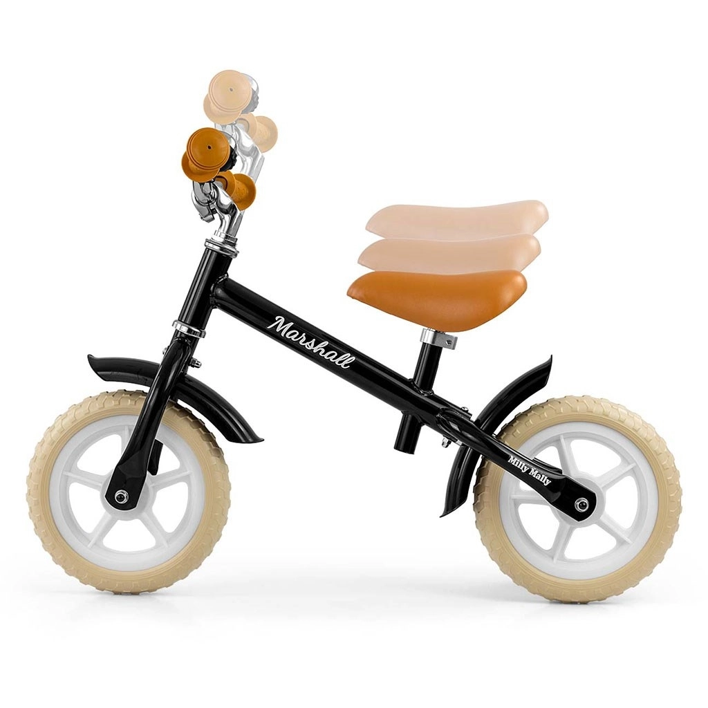 De loopfiets Milly Mally Marshall Zwart is een ideale keuze voor de eerste stapjes richting een fiets. Dankzij de constructie zonder pedalen focust het kind op het behouden van balans en juist sturen. Het lichte maar duurzame stalen frame zorgt voor een lange levensduur en comfort bij dagelijks gebruik.