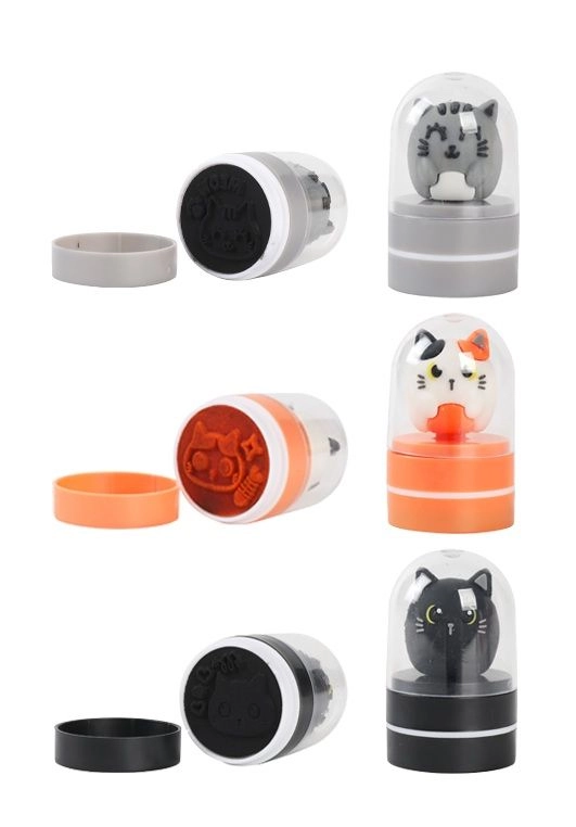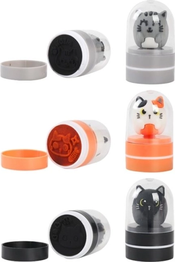 Een schattige set met 36 capsule-stempels met kattenmotieven in drie kleuren – zwart, oranje en wit. Elk stempel heeft een compact formaat, een beschermende transparante kap en is ideaal voor het versieren van schriften, notitieboekjes en kaarten thuis en op school.