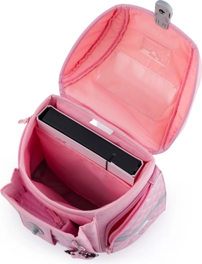 Het doordachte interieur met verdeler, gevoerd vak en praktische zakken houdt orde in boeken, schriften en tussendoortjes. De magnetische sluiting zorgt voor snel en eenvoudig openen, terwijl de stevige bodem met pootjes de vorm behoudt en de inhoud beschermt. Reflecterende elementen verhogen de veiligheid op weg naar en van school.