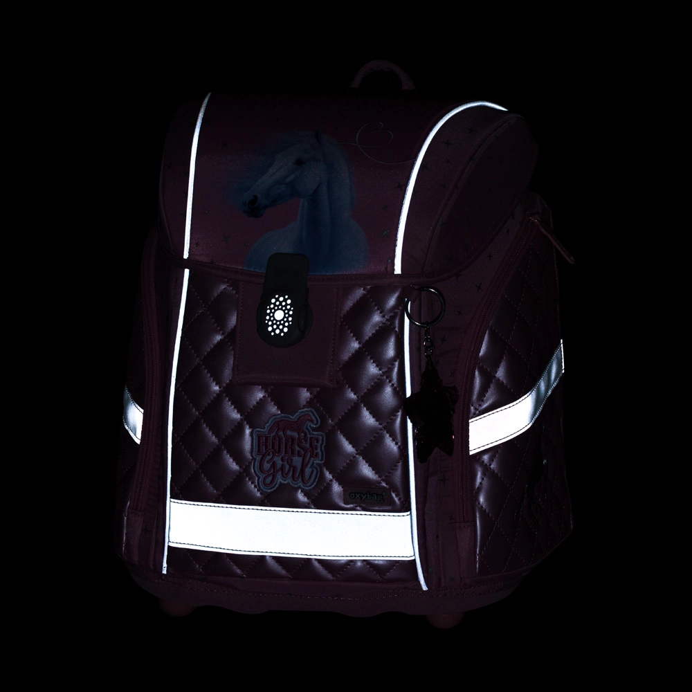 De lichte en ergonomische schoolrugzak Premium Light met het Horse Girl-motief is ideaal voor de onderbouw van de basisschool. Hij weegt slechts 970 g, biedt een inhoud van 26 l, heeft een stevige constructie, ademende padding, brede gewatteerde schouderbanden en borst- en aantrekriemen voor ultiem draagcomfort. Verder zijn er reflecterende elementen, een magnetische sluiting, een interne organizer/verdeling en veel vakken voor overzichtelijke opslag van schoolspullen.