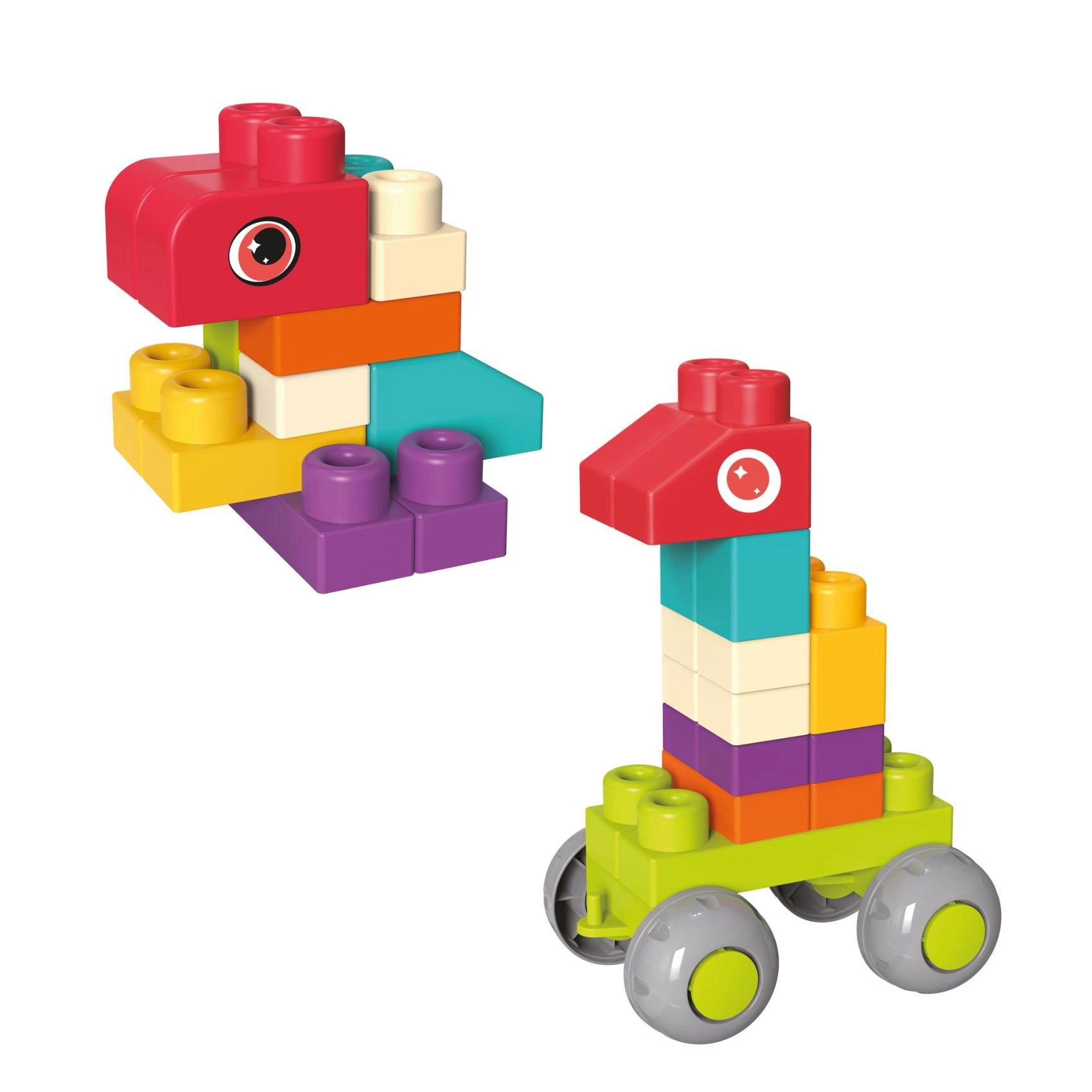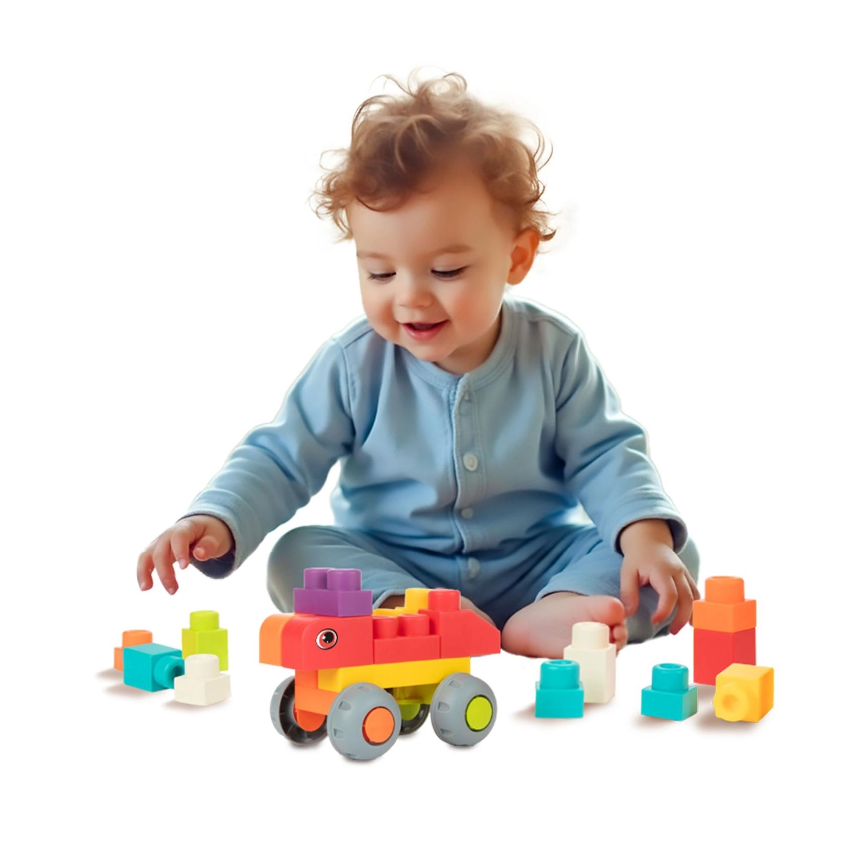 Deze zachte bouwset is een ideale eerste keuze voor de allerkleinste bouwers. Dankzij de afgeronde randen en flexibele onderdelen zijn de blokken veilig voor kleine handjes en toch stevig genoeg voor stabiele bouwwerken. De set bevat 48 kleurrijke elementen, inclusief blokken met oogjesprint en wieltjes voor eenvoudige rijdende karretjes.