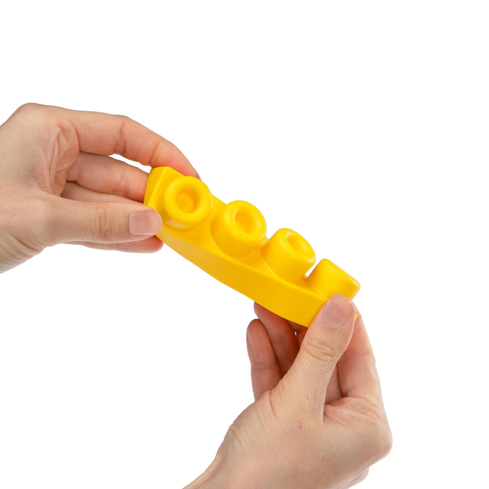Flexibele kunststof blokken met afgeronde randen voelen prettig aan, klikken makkelijk in elkaar en ondersteunen veilig bouwplezier al vanaf 18 maanden.