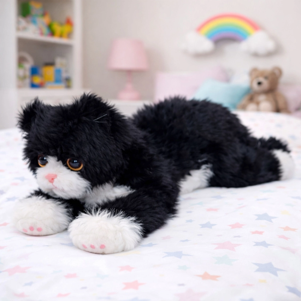 Schattige pluchen kat in zwart‑wit, zacht, knuffelig en klaar om mee te knuffelen. Dankzij het realistische ontwerp, de zachte vacht en veilige, prettige materialen zullen kinderen haar snel in hun hart sluiten als speelkameraadje en slaapknuffel.