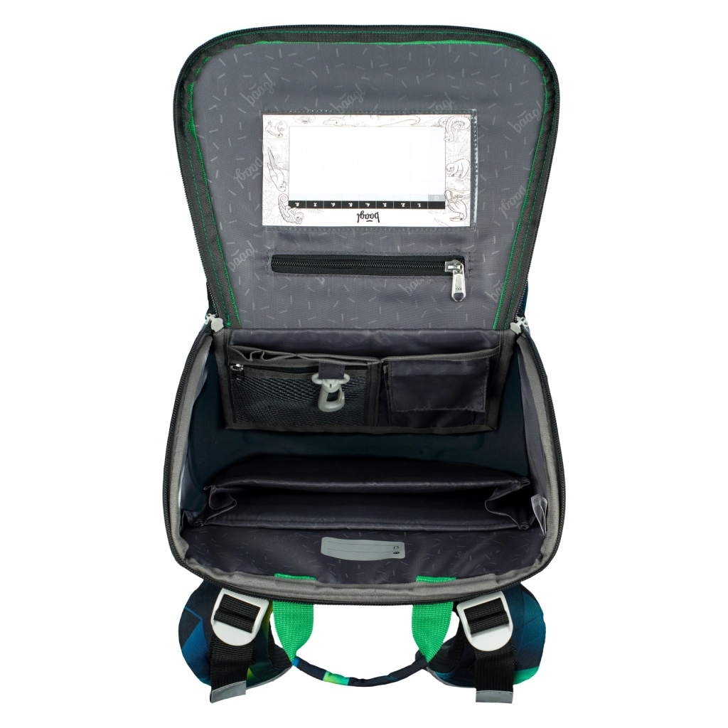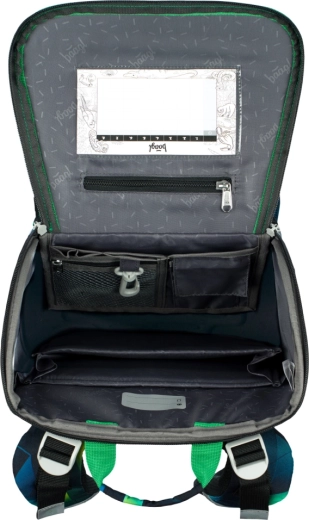 Het klepmechanisme maakt openen mogelijk en geeft toegang tot de spullen direct vanaf de schoolbank. Binnenin vind je een vak voor het rooster, een ritsvak in de klep, verdelers, een meshvak en een sleutelhanger voor perfect orde houden.