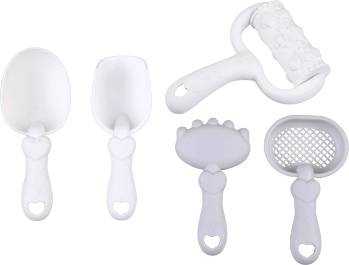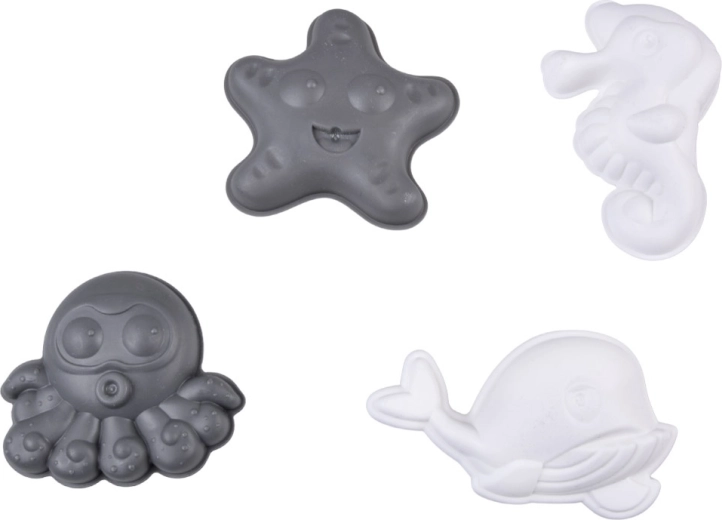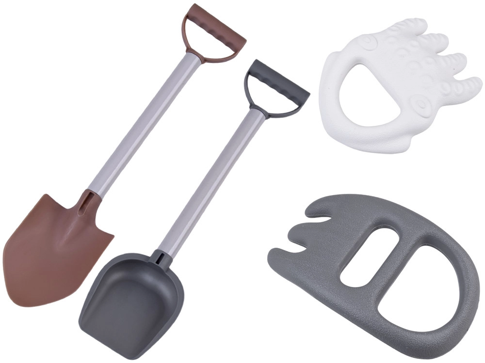 De set bevat alles wat nodig is voor fantasierijk spel: 2 grote scheppen (spade en schop), 2 kleinere schepjes, een hark en grijphark voor grover en fijner werk in het zand, een zeef om te zeven, een emmer, een gieter om te begieten en een wals met zeeprint. Het vormgeven wordt aangevuld met vormpjes van zeedieren – zeester, walvis, octopus en zeepaardje.