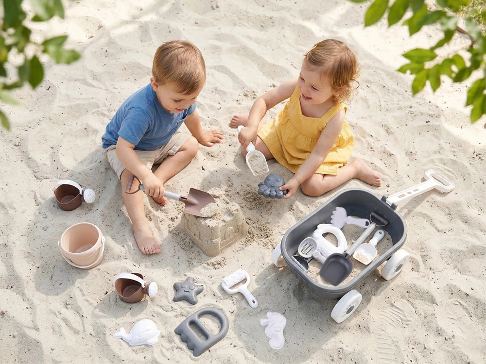 Een stijlvolle zandset met een praktisch wagentje biedt kinderen eindeloos speelplezier op het strand, in de tuin en in de zandbak. Bevat maar liefst 16 stuks in moderne neutrale kleuren, inclusief een trekwagentje, emmer, gieter, scheppen en harken, een zeef en zeevormpjes. Het duurzame kunststof en de brede wielen maken het vervoeren van speelgoed en zand eenvoudig, terwijl kinderen hun creativiteit, fijne motoriek en plezier in buitenspelen ontwikkelen.