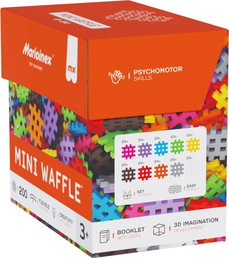 De Marioinex Mini Waffle bouwset biedt talloze creatieve mogelijkheden – van eenvoudige objecten tot gedetailleerde 3D-bouwwerken. De stukjes hebben een zachte, aangename structuur en zijn makkelijk te koppelen en los te maken, wat speels leren, concentratie en geduld bevordert. Dankzij de unieke vorm liggen ze ideaal in kinderhanden en stimuleren ze zelfstandig spel.