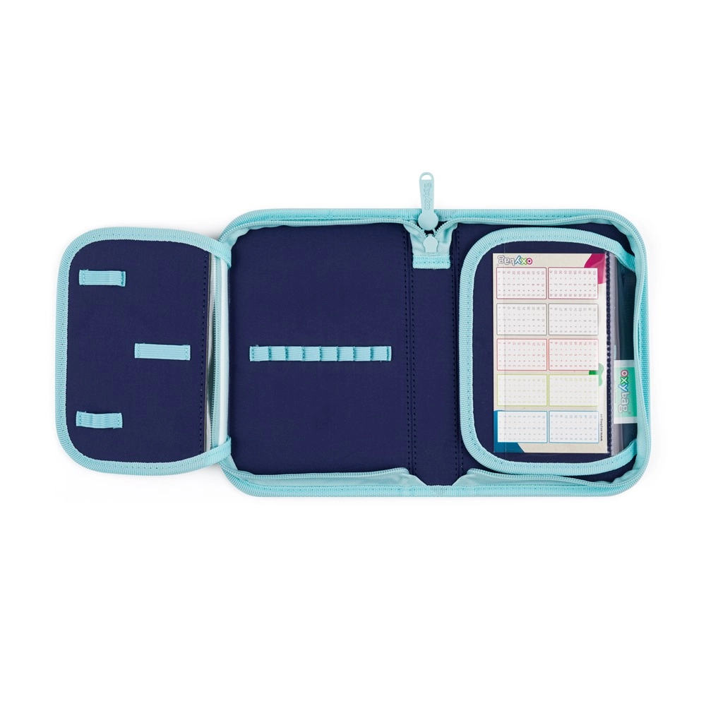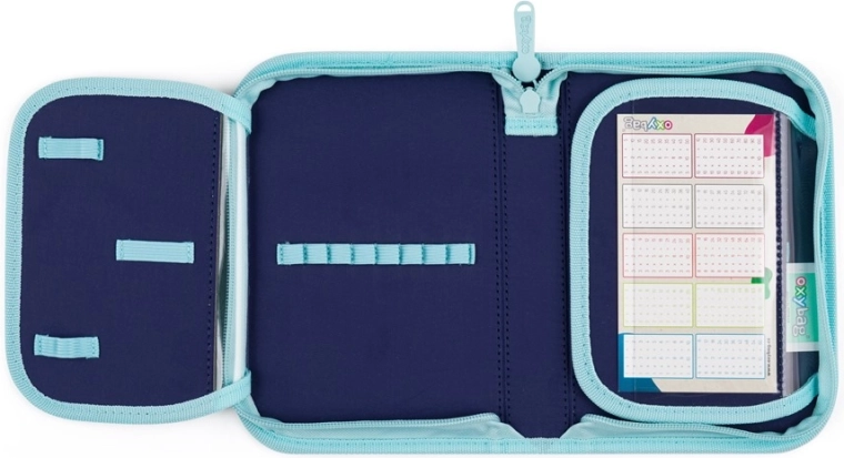 - Éénlaagse etui, 2 flapjes, lussen voor schrijfwaren, venster voor rooster