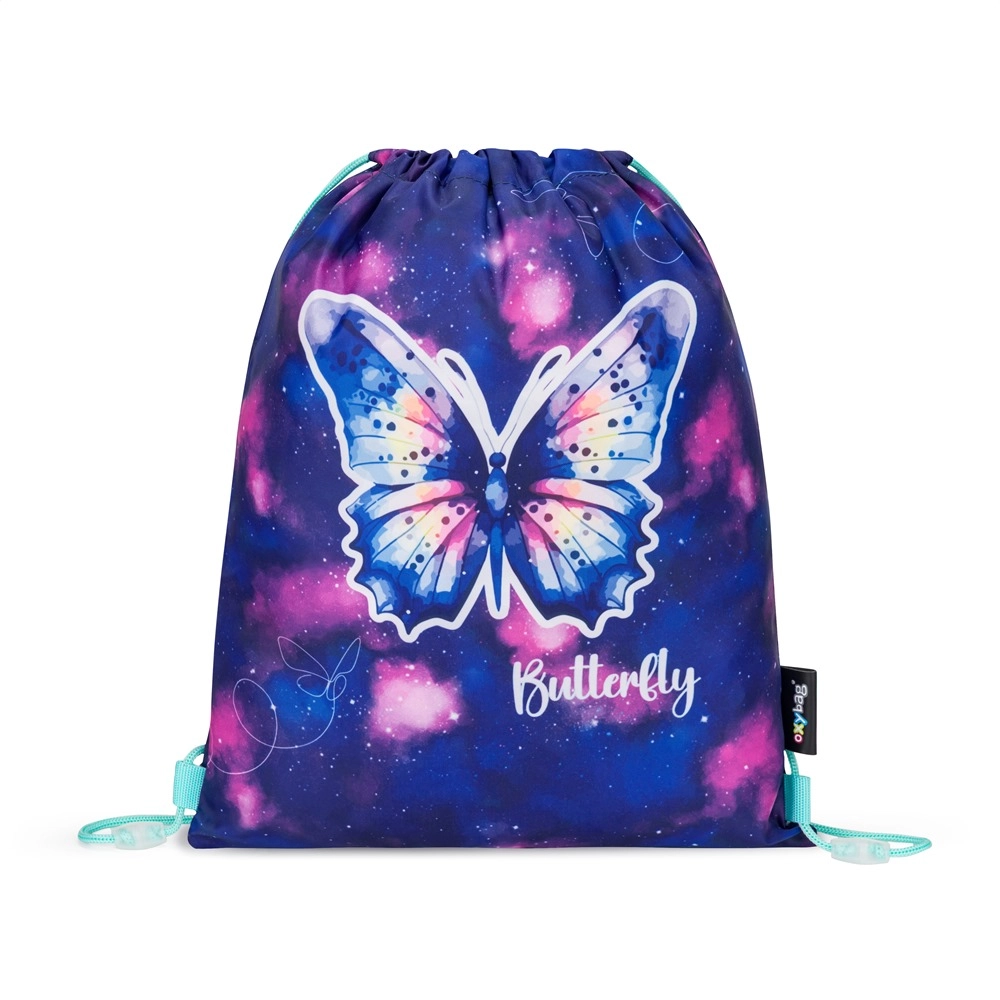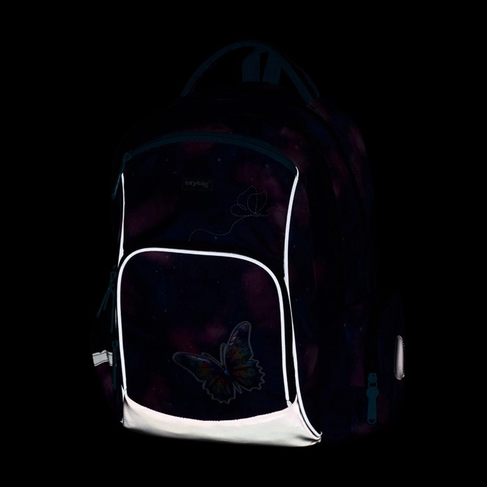 De Oxy Go Vlinder-set in een galactisch design met vlinder oogt fraai en is functioneel. De rugzak biedt comfort dankzij de ergonomische, gewatteerde rug en de verstelbare schouderbanden met haakjes om langere uiteinden vast te zetten. Meerdere vakken en compartimenten zorgen voor overzichtelijke opslag van boeken, schriften en kleinigheden; in de zijvakken past ook een drinkfles.