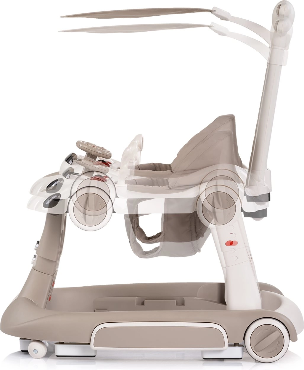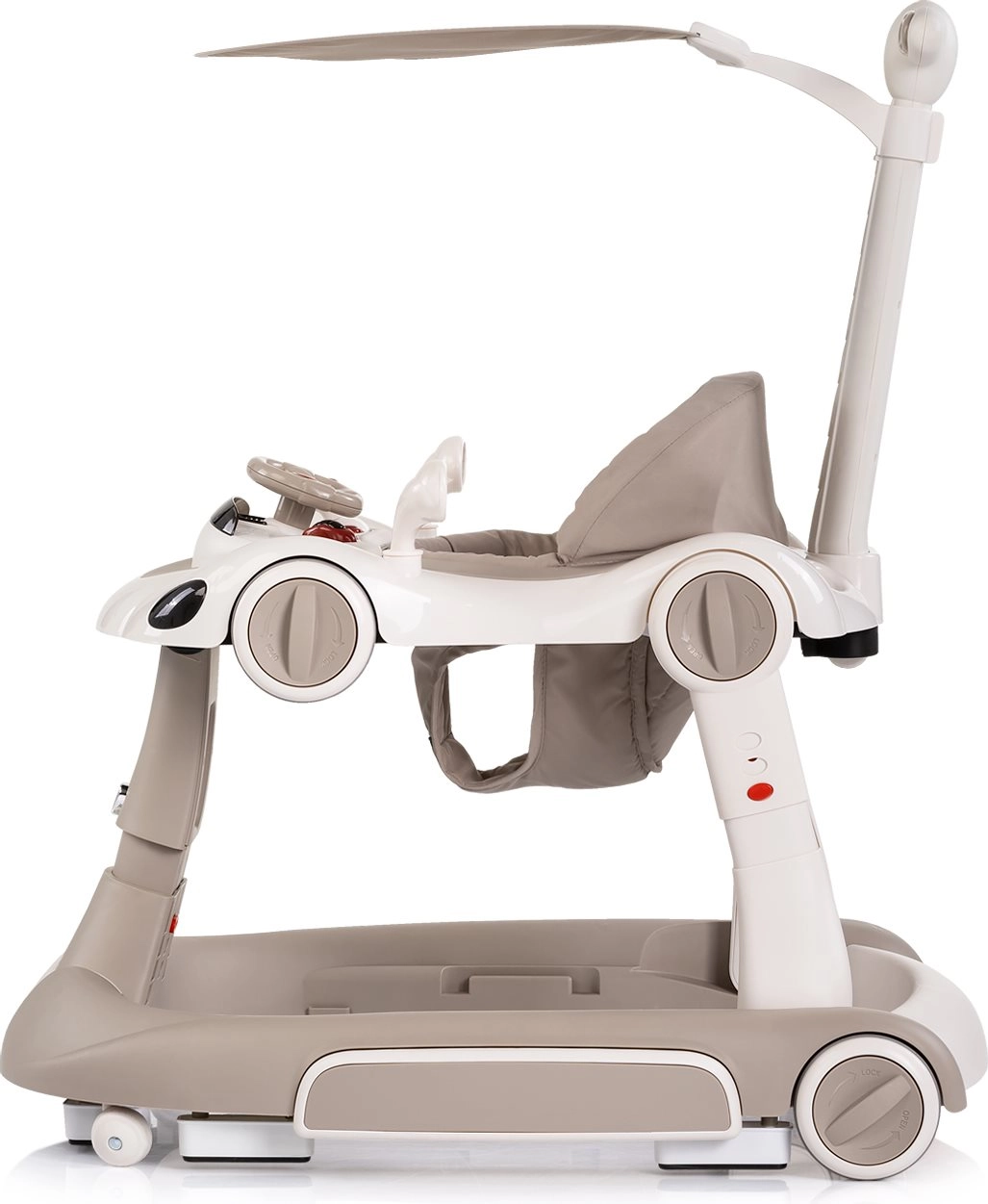 De interactieve 5-in-1 Happy Walker in elegant beige is ontworpen voor comfortabel en veilig leren lopen. De brede en stabiele basis, kwaliteitswieltjes met vergrendeling en snelheidsregeling en de zachte, gewatteerde zitting bieden zekerheid en comfort. Met de ouderduwbeugel kun je je kind veilig begeleiden, terwijl de kap bescherming tegen de zon biedt.