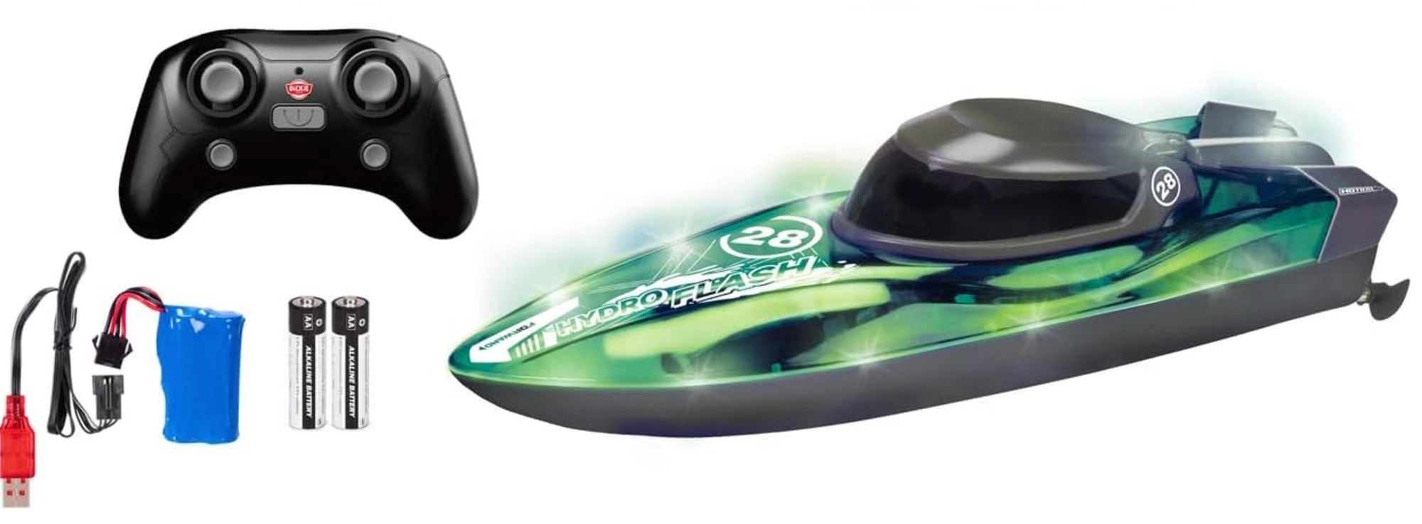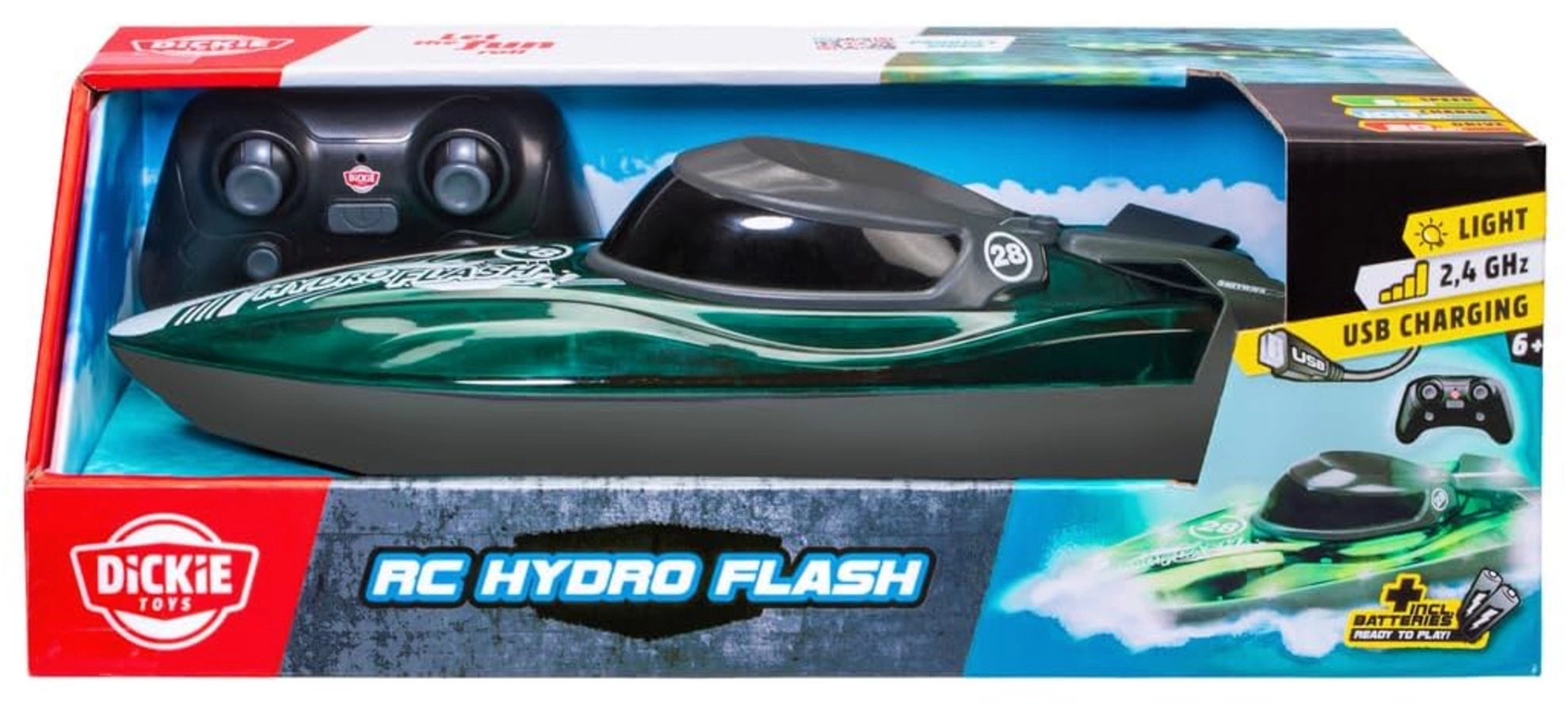 Sensationele snelheid op het water voor kinderen vanaf 6 jaar! De RC boot DICKIE TOYS Hydro Flash met een lengte van 29 cm biedt stabiele 2,4 GHz-besturing, Turbo-modus tot 8 km/u en een opvallende ondervloer-LED-verlichting. Na het opladen rijdt hij tot 20 minuten en is ideaal voor plezier buiten en binnen (geschikt voor bad of zwembad).
