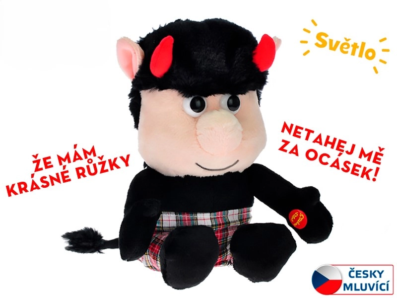 Verwelkom in de kinderkamer een vrolijke metgezel – het duiveltje genaamd Rudla. Deze zachte pluchen knuffel spreekt Tsjechisch wanneer je op zijn handje drukt en zijn hoorntjes knipperen daarbij speels. Dankzij het compacte formaat van 20 cm is hij perfect om thuis mee te spelen en om mee te nemen onderweg.