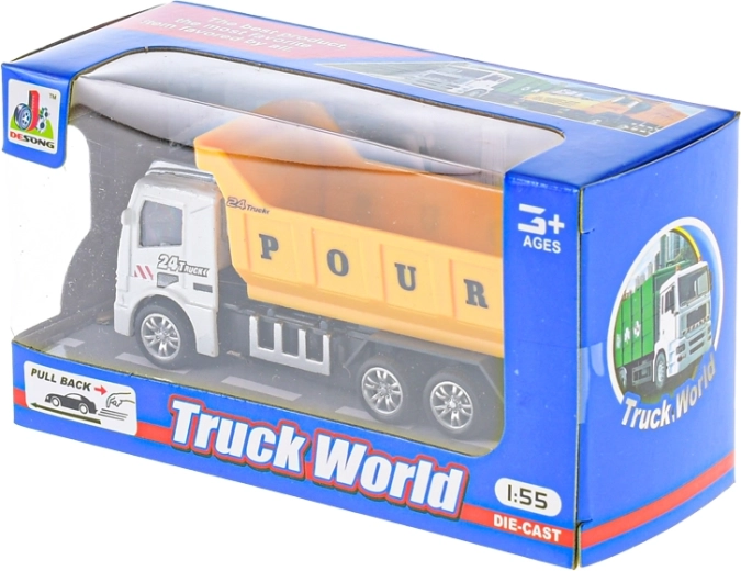 Model van een kiepvrachtwagen in schaal 1:55 met functionele laadbak en zelfstandig rijden na terugtrekken voor nog leuker spel.