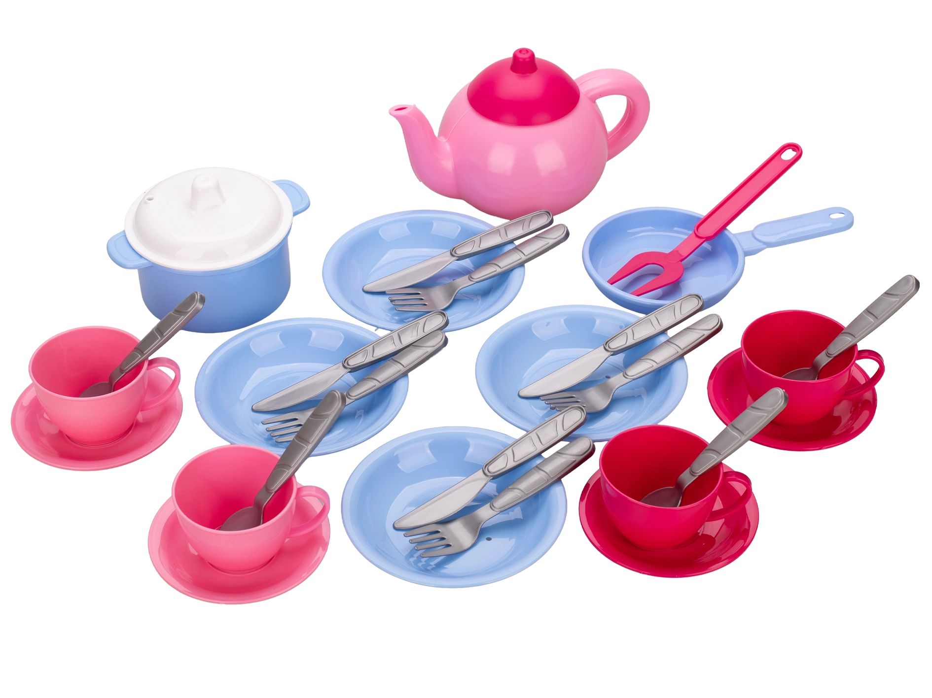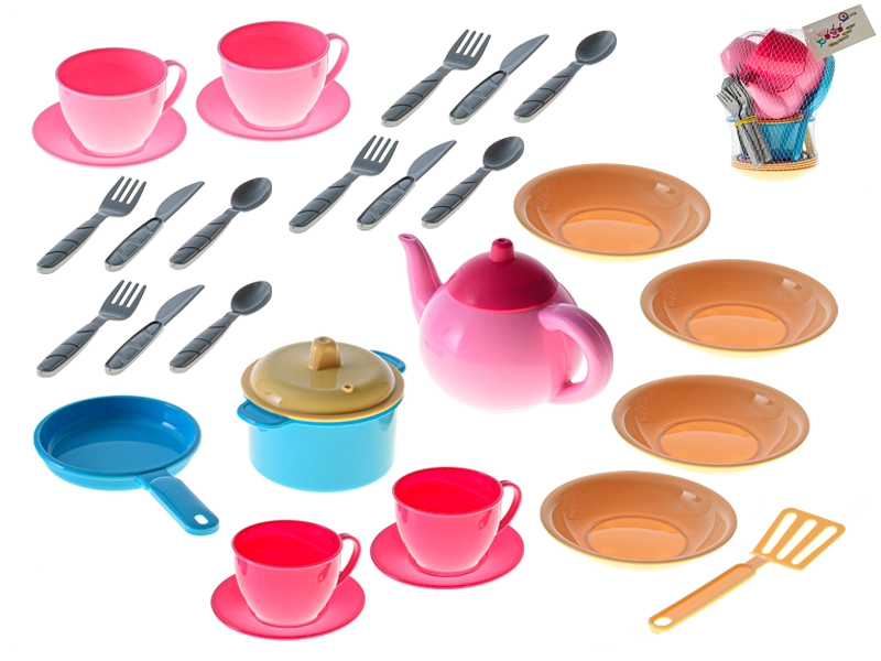 Een leuke kinderkeukenset met 30 kleurrijke onderdelen maakt kleine koks en kokkinnen blij. Bevat een theepot, pan met deksel, koekenpan, borden, bestek, kopjes en schoteltjes voor realistisch koken en serveren. Licht en duurzaam plastic is ideaal voor kinderhandjes en stimuleert fantasie, fijne motoriek en sociale vaardigheden. Geschikt voor kinderen vanaf 3 jaar.