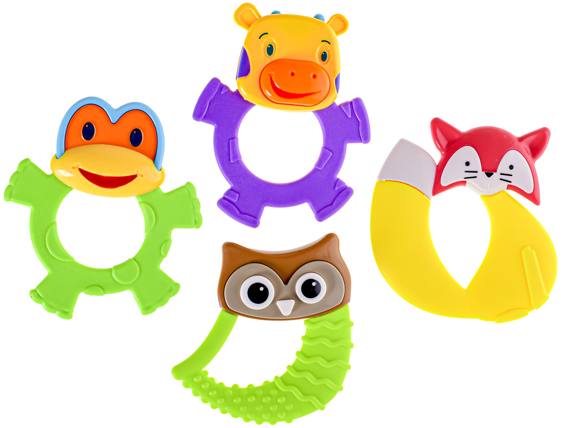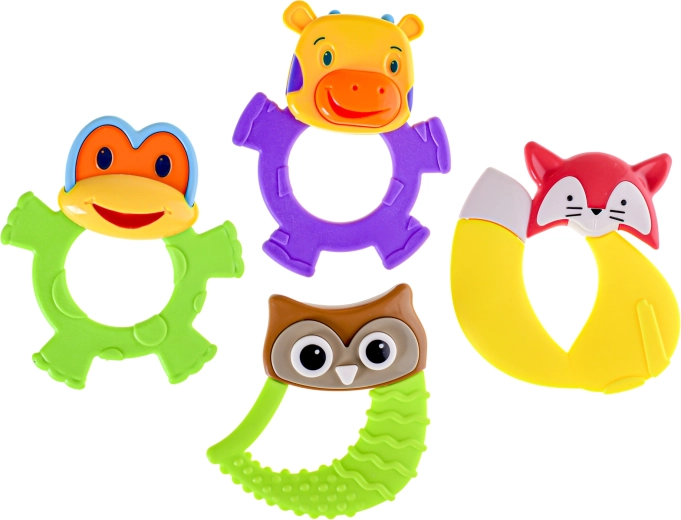 Kies uit 4 schattige varianten – uil, kikker, vos of koe – in 3 vrolijke kleuren. Het gladde en veilige ontwerp is geschikt vanaf 3 maanden. Perfect voor thuis en onderweg.