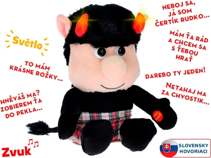 Het schattige duiveltje Rudko maakt jong en oud blij. Hij is gemaakt van zachte pluche en vermaakt je bij het indrukken van zijn hand met Slowaakse zinnetjes, terwijl zijn lichtgevende hoorns knipperen. De compacte hoogte van 20 cm is ideaal om te knuffelen en mee te spelen, en batterijen zijn inbegrepen.